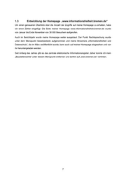 1.3 Entwicklung der Homepage „www.informationsfreiheit.bremen.de“ Um einen genaueren Überblick über die Anzahl der Zugriffe auf meine Homepage zu erhalten, habe ich einen Zähler eingefügt. Die Seite meiner Homepage www.informationsfreiheit.bremen.de wurde von Januar bis Ende November von 38 000 Besuchern aufgerufen. Auch im Berichtsjahr wurde meine Homepage weiter ausgebaut. Der Punkt Rechtsprechung wurde unter dem Menüpunkt Gesetzestexte aufgenommen und meine Broschüre „Informationsfreiheit und Datenschutz“, die im März veröffentlicht wurde, kann auch auf meiner Homepage eingesehen und von ihr heruntergeladen werden. Seit Anfang des Jahres gibt es das zentrale elektronische Informationsregister, daher konnte ich mein „Baustellenschild“ unter diesem Menüpunkt entfernen und dorthin auf „www.bremen.de“ verlinken. 7