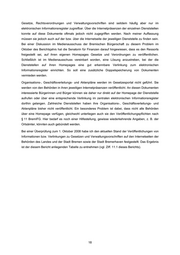 Gesetze, Rechtsverordnungen und Verwaltungsvorschriften sind seitdem häufig aber nur im elektronischen Informationsregister zugreifbar. Über die Internetpräsenzen der einzelnen Dienststellen konnte auf diese Dokumente oftmals jedoch nicht zugegriffen werden. Nach meiner Auffassung müssen sie jedoch auch auf der bzw. über die Internetseite der jeweiligen Dienststelle zu finden sein. Bei einer Diskussion im Medienausschuss der Bremischen Bürgerschaft zu diesem Problem im Oktober des Berichtsjahrs hat die Senatorin für Finanzen darauf hingewiesen, dass es den Ressorts freigestellt sei, auf ihren eigenen Homepages Gesetze und Verordnungen zu veröffentlichen. Schließlich ist im Medienausschuss vereinbart worden, eine Lösung anzustreben, bei der die Dienststellen auf ihren Homepages eine gut erkennbare Verlinkung zum elektronischen Informationsregister einrichten. So soll eine zusätzliche Doppelspeicherung von Dokumenten vermieden werden. Organisations-, Geschäftsverteilungs- und Aktenpläne werden im Gesetzesportal nicht geführt. Sie werden von den Behörden in ihren jeweiligen Internetpräsenzen veröffentlicht. An diesen Dokumenten interessierte Bürgerinnen und Bürger können sie daher nur direkt auf der Homepage der Dienststelle aufrufen oder über eine entsprechende Verlinkung im zentralen elektronischen Informationsregister dorthin gelangen. Zahlreiche Dienststellen haben ihre Organisations-, Geschäftsverteilungs- und Aktenpläne bisher nicht veröffentlicht. Ein besonderes Problem ist dabei, dass nicht alle Behörden über eine Homepage verfügen, gleichwohl unterliegen auch sie den Veröffentlichungspflichten nach § 11 BremIFG. Hier bedarf es noch einer Hilfestellung, gewisse wiederkehrende Angaben, z. B. der Ortsämter, könnten auch gebündelt werden. Bei einer Überprüfung zum 1. Oktober 2008 habe ich den aktuellen Stand der Veröffentlichungen von Informationen bzw. Verlinkungen zu Gesetzen und Verwaltungsvorschriften auf den Internetseiten der Behörden des Landes und der Stadt Bremen sowie der Stadt Bremerhaven festgestellt. Das Ergebnis ist der diesem Bericht anliegenden Tabelle zu entnehmen (vgl. Ziff. 11.1 dieses Berichts). 18