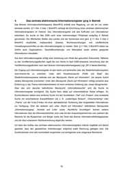5. Elektronischer Informationszugangsantrag Informationszugangsanträge der Bürgerinnen und Bürger gegenüber der Verwaltung können seit Ende des Berichtsjahres auch mittels eines elektronischen Antragsformulars gestellt werden. Auf der Internetseite „bremen.de“ findet sich unter dem Menüpunkt „Politik und Staat“ in der Rubrik „Recht auf Information“ (Informationszugang) nunmehr ein Formular zur elektronischen Unterstützung des individuellen Antrags. Die Möglichkeit der erleichterten Abwicklung des Informationsbegehrens auf elektronischem Wege ist ein weiterer begrüßenswerter Schritt auf dem Weg, die Akzeptanz des Bremer Informationsfreiheitsgesetzes (BremIFG) in der Bevölkerung zu erhöhen und eine vermehrte Inanspruchnahme der eingeräumten gesetzlichen Informationsmöglichkeiten durch Bürgerinnen und Bürger zu fördern. 20