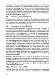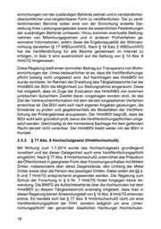 einrichtungen von der zuständigen Behörde zeitnah und in verständlicher, übersichtlicher und vergleichbarer Form zu veröffentlichen. Die zu veröf- fentlichenden Berichte sollen eine von der Einrichtung erstellte Dar- stellung ihres Leistungsangebotes sowie die wesentlichen Feststellungen der zuständigen Behörde umfassen. Hinzu kommen eventuelle Stellung- nahmen von Mitwirkungsgremien und in anderen Prüfverfahren ge- wonnene Informationen, sofern diese die Ergebnisqualität der Wohnein- richtung darstellen (§ 17 WBDurchfVO). Nach § 18 Satz 2 WBDurchfVO hat die Veröffentlichung für alle Bezirke gemeinsam im Internet zu erfolgen, in Satz 3 wird ausdrücklich auf die Geltung von § 10 Abs. 8 HmbTG hingewiesen. Diese Regelung stellt einen sinnvollen Beitrag zur Transparenz von Wohn- einrichtungen dar. Umso bedauerlicher ist es, dass die Veröffentlichungs- pflicht bislang nicht umgesetzt wird. Auf Nachfragen des HmbBfDI hin wurde vertröstet. Im Rahmen der Erstellung des Tätigkeitsberichts hat der HmbBfDI der BGV die Möglichkeit zur Stellungnahme eingeräumt. Diese hat mitgeteilt, dass im Zuge der Evaluation des HmbWBG von externen juristischen Gutachtern Zweifel daran vorgetragen worden sind, ob das Ziel der Verbraucherinformation mit dem derzeit vorgesehenen Verfahren erreichbar ist. Die BGV sieht sich nach eigenen Angaben gezwungen, die Einwände zu prüfen und gegebenenfalls die Modalitäten der Veröffent- lichung der Prüfergebnisse anzupassen. Der HmbBfDI begrüßt, dass die BGV wohl sehr gründlich prüft, bevor die Veröffentlichungspflichten umge- setzt werden. Gleichzeitig ist die momentane Sachlage mit dem geltenden Recht derzeit nicht vereinbar. Der HmbBfDI bleibt weiter mit der BGV in Kontakt. 2.5.2 § 77 Abs. 8 Hochschulgesetz (HmbHochschulG) Mit Wirkung zum 1.7.2014 wurde das Hochschulgesetz grundlegend novelliert und bei dieser Gelegenheit auch eine Veröffentlichungspflicht eingeführt. Nach § 77 Abs. 8 HmbHochschulG unterrichtet das Präsidium die Öffentlichkeit in geeigneter Form über Forschungsvorhaben mit Mitteln Dritter, insbesondere über deren Gegenstände, den Umfang der Mittel Dritter sowie über die Person des jeweiligen Dritten. Dabei sollen die §§ 4, 6 und 7 HmbTG entsprechend angewendet werden. Die Regelung zum Schutz der Forschung in § 5 Nr. 7 HmbTG findet hingegen keine An- wendung. Die BWFG als Aufsichtsbehörde über die Hochschulen hat dem HmbBfDI zu diesem Tätigkeitsbericht erstmalig mitgeteilt, dass man in dieser Regelung keinen Anwendungsfall von § 10 Abs. 8 HmbTG erkennen könne. Es handele sich bei § 77 Abs. 8 HmbHochschulG nicht um eine Veröffentlichungspflicht der FHH, sondern lediglich um eine „Unter- richtungspflicht“ der genannten staatlichen Hamburger Hochschulen. 16
