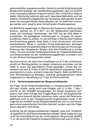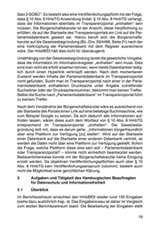 sensvorschriften angesehen werden. Hierdurch wird die Entscheidung der Bürgerschaft bestätigt, den Veröffentlichungspflichten nach § 3 HmbTG einen voraussetzungslosen Anspruch nach § 1 Abs. 2 HmbTG zur Seite zu stellen. Gleichzeitig zeigt sich aber auch, dass diese Maßnahme auch bei anderen Veröffentlichungspflichten der Verwaltung hätte gewählt werden sollen. Nur eine gerichtliche Überprüfbarkeit, die von jedermann erzwun- gen werden kann, sorgt für einen hinreichenden Umsetzungsdruck. Die BWFG hat angekündigt, im Rahmen des Programms Hamburg Open Science, welches am 21.11.2017 von der Bürgerschaft beschlossen wurde, die Hamburger Hochschulen, das UKE und die SUB dabei zu unterstützen, die gestiegenen Anforderungen im Umgang mit wissen- schaftlichen Daten zu erfüllen. Im Jahr 2018 sei im Rahmen des Projektes eine Entwicklung geplant, diese Daten in einer strukturierten und somit standardisierten Weise in zentralen Online-Datenspeichern abzulegen und hierauf einen transparenten Zugriff von Einrichtungen der Forschungs- förderung oder interessierten Bürgern über eine Portallösung zu ermög- lichen. Um eine konkrete Handlungssicherheit der Wissenschaftlerinnen und Wissenschaftler bei den Veröffentlichungspflichten zu erzielen, wird im Jahr 2018 ein Rechtsgutachten erstellt. Ob es sinnvoll ist, vier Jahre nach Inkrafttreten von § 77 Abs. 8 HmbHoch- schulG ein Rechtsgutachten zu dessen Umsetzung einzuholen und die Daten in einem neu geschaffenen Portal abzulegen, anstatt das vor- handene und nach § 10 Abs. 8 HmbTG verpflichtend vorgesehene Trans- parenzportal zu nutzen, erscheint indes eher fraglich. Sollte die BWFG an ihrer Rechtsauffassung festhalten, bestünde gesetzgeberischer Hand- lungsbedarf zur Klarstellung in § 77 Abs. 8 HmbHochschulG. 2.5.3 Parlamentsdatenbank der Bürgerschaftskanzlei Die Frage, ob die Parlamentsdatenbank im Transparenzportal veröffent- licht sein müsste, wurde durch eine Eingabe nach § 14 Abs. 1 Satz 1 HmbTG an den HmbBfDI herangetragen. Ein Bürger beschwerte sich, dass er nach einer Anfrage über FragdenStaat.de an die Bürgerschafts- kanzlei keine Auskunft darüber bekommen habe, warum die Parlaments- datenbank nicht an das Transparenzportal angeschlossen werde. In der Folge hat der HmbBfDI mit der Bürgerschaftskanzlei nicht nur die Heraus- gabe eines entsprechenden Vermerks diskutiert, sondern auch die Frage, warum dies denn nicht erfolgt. Zunächst hat die Bürgerschaftskanzlei mitgeteilt, dass eine Veröffentli- chungspflicht für die Parlamentsdatenbank besteht. Diese ergebe sich aus „§ 60 der Geschäftsordnung der Hamburgischen Bürgerschaft (GOBÜ) i.V.m. der durch die Präsidentin erlassene Richtlinie oder auch § 19 Abs. 1 18