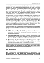 Handel und Wirtschaft werden. Wenn das Unternehmen den Score-Wert nicht selbst errechnet, sondern von einem Dienstleistungsunternehmen oder einer Auskunftei erhält, ist auch für das Unternehmen selbst häufig nicht erkennbar, welche Merkmale die konkrete Bewertung maßgeblich prägen. Es erfährt nur, dass die Person zur Risikoklasse „F“ mit einem „Ausfallrisiko 34,73 %“ gehört. Das verrät nichts über die eventuell zweifelhaften Kriterien oder eine veraltete Datenbasis, die der Berechnung zugrunde liegen können. Die mangelnde Transparenz schränkt die Möglichkeit der Betroffenen ein, gegebenenfalls Mängel der dem Scoring zugrunde liegenden Daten festzu- stellen. Zugleich können sich die Betroffenen auch nicht als Ausnahme von der statistischen Regel beweisen. Das ist besonders dann verhängnisvoll, wenn der negative Score-Wert automatisiert ohne Beteiligung eines Men- schen zur Ablehnung des Vertrags führt. Beeinträchtigende Entscheidungen wie die Ablehnung eines Vertragsschlusses dürfen nach dem BDSG nicht ausschließlich auf Basis von Scoring-Verfahren getroffen werden. Scoring-Verfahren zur Bonitätsprüfung sollten neben dem gesetzlichen Ver- bot der automatisierten Einzelentscheidung die folgenden drei Eckpunkte beachten: 1. Solide Datengrundlage: Beschränkung auf branchenrelevante und zutreffende Informationen zu Zahlungsverhalten, Einkommens- und Vermögensverhältnissen. 2. Diskriminierungsverbot: Geschlecht, Herkunft, Wohnumfeld sowie sensitive Daten der Bewerteten dürfen nicht in den Score einfließen. Auch das Alter der Betroffenen ist nur bedingt bonitätsrelevant. 3. Transparenz: Die Beurteilten müssen nachvollziehen können, welche Daten zu ihrer Person in die Berechnung einfließen und welche Merkmale ihren aktuellen Score-Wert maßgeblich prägen. Damit Scoring-Verfahren zur Bonitätsbewertung nicht zu Benachteiligungen führen, müssen die Verfahren in jedem Fall auf einer soliden Datengrundlage arbeiten und Transparenz gewährleisten. 5.8 Kreditfabriken Jede zweite deutsche Bank plant, innerhalb der nächsten Zeit Teile ihres Geschäfts wie zum Beispiel den Zahlungsverkehr oder das Wertpapiergeschäft an externe Dienstleistungsbetriebe auszulagern. LDI NRW 17. Datenschutzbericht 2005 63