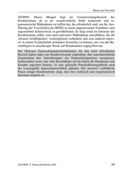 Handel und Wirtschaft 2830/99). Dieser Mangel liegt im Verantwortungsbereich des Kreditinstituts, da es als verantwortliche Stelle technische und or- ganisatorische Maßnahmen zu treffen hat, die erforderlich sind, um die Aus- führung der Vorschriften des BDSG in einem angemessenen Verhältnis zum angestrebten Schutzzweck zu gewährleisten. Es liegt somit im Interesse des Kreditinstituts selbst, zum einen präventiv Maßnahmen einzuführen, die die ‚kleinen Gefälligkeiten’ weitestgehend verhindern und zum anderen repres- siv in einem Verdachtsfall zumindest feststellen zu können, wer von den Be- schäftigten in unzulässiger Weise auf Kundendaten zugegriffen hat. Die Obersten Datenschutzaufsichtsbehörden für den nicht öffentlichen Bereich haben daher der Kreditwirtschaft empfohlen, ihre innerbetriebliche Organisation den Anforderungen des Datenschutzgesetzes anzupassen. Insbesondere wenn sehr viele Beschäftigte auf die Daten der Kundinnen und Kunden zugreifen können, ist eine generelle Protokollierungspflicht auch der Lesezugriffe datenschutzrechtlich geboten. Die insoweit vorbildliche Praxis einiger Kreditinstitute zeigt, dass dies technisch und organisatorisch durchaus möglich ist. LDI NRW 17. Datenschutzbericht 2005 69