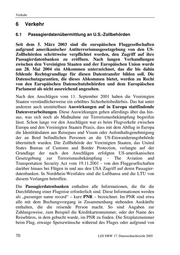 Verkehr Erkrankungen oder Behinderungen einer reisenden Person zu treffende Vorkehrungen sind ebenfalls in der Passagierdatenbank vermerkt. Gängige Bezeichnungen im PNR für solche Vorkehrungen sind cosher, moslem, hindu oder vegetarian meal für die Speisewünsche. Hinter den Systemkürzeln WCHR, BLD, DIS verbergen sich die Begriffe wheal chair, blind passenger, disabled passenger. Die meisten Passagiersysteme enthalten auch Felder, die mit einem beliebigen so genannten Freitext ausgestattet sein können. Es sollen sich darin vereinzelt sogar Vermerke dazu finden, dass Personen auf Flugreisen durch Alkoholmissbrauch oder Randalieren aufgefallen sind. Der von den Vereinigten Staaten verlangte Zugriff auf diese Passagierdaten war nach europäischem und deutschem Datenschutzrecht unzulässig. Ein wesentliches Problem bereitete die Tatsache, dass es in den Vereinigten Staaten insbesondere für Personen, die nicht die amerikanische Staatsbürgerschaft besitzen, keine angemessenen Datenschutzrechte gibt. Die Fluggesellschaften wurden daher mit den sich widersprechenden Rechtsanforderungen der Vereinigten Staaten zum Zwecke der Terrorismus- und Kriminalitätsbekämpfung einerseits und der Europäischen Union zum Datenschutz andererseits konfrontiert. Beide Rechtssysteme belegen ihre Nichtbefolgung mit empfindlichen Geldbußen. In diesem Dilemma für die Fluggesellschaften wollte die Europäische Kommission Unterstützung leisten und hat Verhandlungen mit den Vereinigten Staaten über die Bedingungen, unter denen die Übermittlung von Passagierdaten möglich ist, aufgenommen. Die Ergebnisse dieser Verhandlungen sind in einer Verpflichtungserklärung der US-Zollbehörde vom 11.05.2004 festgehalten. Mit einer Entscheidung vom 14.05.2004 hat die Europäische Kommission daraufhin festgestellt, dass das Datenschutzniveau bei der Verarbeitung der Passagierdaten in den USA angemessen sei. Des Weiteren wurde am 28.05.2004 ein Abkommen zwischen der Europäischen Union und den Vereinigten Staaten über die Passagierdatenübermittlung unterzeichnet. Aus Sicht der Kommission sind damit die Rechtsgrundlagen geschaffen, die die Übermittlung ermöglichen. Die einzelnen Dokumente sind nachzulesen unter www.europa.eu.int. Das Europäische Parlament hat Klage vor dem Europäischen Gerichtshof erhoben, um überprüfen zu lassen, ob die Rechte der Fluggäste aufgrund der Anerkennungsentscheidung vom 14.05.2004 und des Abkommens vom 28.05.2004 verletzt werden und eine Zustimmung des Parlamentes zu dem Abkommen erforderlich gewesen wäre. Tatsächlich sind auch nach LDI NRW 17. Datenschutzbericht 2005 71