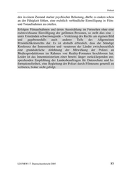 Polizei den in einem Zustand starker psychischer Belastung, dürfte es zudem schon an der Fähigkeit fehlen, eine rechtlich verbindliche Einwilligung in Film- und Tonaufnahmen zu erteilen. Erfolgen Filmaufnahmen und deren Ausstrahlung im Fernsehen ohne eine rechtswirksame Einwilligung der gefilmten Personen, so stellt dies eine – unter Umständen schwerwiegende – Verletzung des Rechts am eigenen Bild und gegebenenfalls auch anderer Teile des Allgemeinen Persönlichkeitsrechts dar. Es ist deshalb erfreulich, dass die Ständige Konferenz der Innenminister und -senatoren der Länder zwischenzeitlich eine grundsätzliche Ablehnung der Mitwirkung der Polizei an Medienproduktionen im Rahmen von Reality-Formaten beschlossen hat. Leider ist das Innenministerium einer bereits länger zurückliegenden ent- sprechenden Empfehlung der Landesbeauftragen für Datenschutz und In- formationsfreiheit, eine Begleitung der Polizei durch Filmteams generell zu verbieten, bisher nicht gefolgt. LDI NRW 17. Datenschutzbericht 2005 85