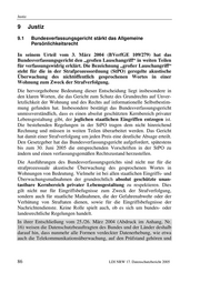 Justiz 9 Justiz 9.1 Bundesverfassungsgericht stärkt das Allgemeine Persönlichkeitsrecht In seinem Urteil vom 3. März 2004 (BVerfGE 109/279) hat das Bundesverfassungsgericht den „großen Lauschangriff“ in weiten Teilen für verfassungswidrig erklärt. Die Bezeichnung „großer Lauschangriff“ steht für die in der Strafprozessordnung (StPO) geregelte akustische Überwachung des nichtöffentlich gesprochenen Wortes in einer Wohnung zum Zweck der Strafverfolgung. Die hervorgehobene Bedeutung dieser Entscheidung liegt insbesondere in den klaren Worten, die das Gericht zum Schutz des Grundrechts auf Unver- letzlichkeit der Wohnung und des Rechts auf informationelle Selbstbestim- mung gefunden hat. Insbesondere bestätigt das Bundesverfassungsgericht unmissverständlich, dass es einen absolut geschützten Kernbereich privater Lebensgestaltung gibt, der jeglichen staatlichen Eingriffen entzogen ist. Die bestehenden Regelungen in der StPO tragen dem nicht hinreichend Rechnung und müssen in weiten Teilen überarbeitet werden. Das Gericht hat damit einer Strafverfolgung um jeden Preis eine deutliche Absage erteilt. Den Gesetzgeber hat das Bundesverfassungsgericht aufgefordert, spätestens bis zum 30. Juni 2005 die entsprechenden Vorschriften in der StPO zu ändern und einen verfassungsgemäßen Rechtszustand herzustellen. Die Ausführungen des Bundesverfassungsgerichts sind nicht nur für die strafprozessuale akustische Überwachung des gesprochenen Wortes in Wohnungen von Bedeutung. Vielmehr ist bei allen staatlichen Eingriffs- und Überwachungsmaßnahmen der grundrechtlich absolut geschützte unan- tastbare Kernbereich privater Lebensgestaltung zu respektieren. Dies gilt nicht nur für Eingriffsbefugnisse zum Zweck der Strafverfolgung, sondern auch für staatliche Maßnahmen, die der Gefahrenabwehr oder der Verhütung von Straftaten dienen, sowie für die Eingriffsbefugnisse der Nachrichtendienste. Keine Rolle spielt auch, ob es sich um bundes- oder landesrechtliche Regelungen handelt. In ihrer Entschließung vom 25./26. März 2004 (Abdruck im Anhang, Nr. 16) weisen die Datenschutzbeauftragten des Bundes und der Länder deshalb darauf hin, dass nunmehr alle Formen verdeckter Datenerhebung, wie etwa auch die Telekommunikationsüberwachung, auf den Prüfstand gehören und 86 LDI NRW 17. Datenschutzbericht 2005