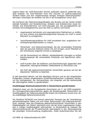 Anhang zogene Daten der VoIP-Nutzenden können außerdem dadurch gefährdet sein, dass Anbieter von VoIP-Diensten ihren Sitz mitunter im außereuropäischen Ausland haben und dort möglicherweise weniger strengen Datenschutzanfor- derungen unterliegen als Anbieter mit Sitz in der Europäischen Union (EU). Die Konferenz der Datenschutzbeauftragten des Bundes und der Länder fordert deshalb Hersteller und Herstellerinnen, Anbieter und Anbieterinnen sowie An- wender und Anwenderinnen von VoIP-Lösungen auf, das grundgesetzlich ge- schützte Fernmeldegeheimnis auch bei VoIP zu wahren und hierfür angemessene technische und organisatorische Maßnahmen zu treffen, um eine sichere und datenschutzgerechte Nutzung von VoIP in einem Netzwerk zu ermöglichen, Verschlüsselungsverfahren für VoIP anzubieten bzw. angebotene Ver- schlüsselungsmöglichkeiten zu nutzen, Sicherheits- und Datenschutzmängel, die die verwendeten Protokolle oder die genutzte Software bisher mit sich bringen, durch Mitarbeit an der Entwicklung möglichst schnell zu beseitigen, auf die Verwendung von offenen, standardisierten Lösungen zu achten beziehungsweise die verwendeten Protokolle und Algorithmen offen- zulegen, VoIP-Kunden über die Gefahren und Einschränkungen gegenüber dem klassischen, leitungsvermittelten Telefondienst zu informieren und bei VoIP alle datenschutzrechtlichen Vorschriften genauso wie bei der klassischen Telefonie zu beachten. In den benutzten Netzen, auf den beteiligten Servern und an den eingesetzten Endgeräten müssen angemessene Sicherheitsmaßnahmen umgesetzt werden, um die Verfügbarkeit, die Vertraulichkeit, die Integrität und die Authentizität der übertragenen Daten zu gewährleisten. Unabhängige Datenschutzkontrolle in Deutschland gewährleisten Anlässlich eines von der Europäischen Kommission am 5. Juli 2005 eingeleite- ten Vertragsverletzungsverfahrens gegen die Bundesrepublik Deutschland zur Unabhängigkeit der Datenschutzkontrolle fordert die Konferenz erneut eine völ- lig unabhängige Datenschutzkontrolle. Die Richtlinie 95/46/EG zum Schutz natürlicher Personen bei der Verarbeitung personenbezogener Daten und zum freien Datenverkehr (EG-Datenschutzricht- linie) verlangt, dass die Einhaltung datenschutzrechtlicher Vorschriften in den Mitgliedstaaten von Stellen überwacht wird, die die ihnen zugewiesenen Aufga- ben in völliger Unabhängigkeit wahrnehmen. In Deutschland ist indessen die Datenschutzkontrolle der Privatwirtschaft überwiegend in den Weisungsstrang der jeweiligen Innenverwaltung eingebunden. Diese Aufsichtsstruktur bei der LDI NRW 18. Datenschutzbericht 2007 173