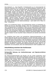 Anhang Dies bedeutet u.a., dass Eingriffe in Freiheitsrechte nur im überwiegenden öf- fentlichen Interesse und im Rahmen der Verhältnismäßigkeit zulässig sind. Die Rahmenrichtlinie muss die Voraussetzungen der Datenverarbeitung und -über- mittlung nach den jeweiligen Rollen der Verfahrensbeteiligten (Beschuldigte, Verdächtigte, Zeugen und Zeuginnen, Opfer) normenklar und differenziert re- geln. Zudem müssen die Rechte der Betroffenen auf Auskunft, Berichtigung und Löschung gewährleistet werden. Die Datenverarbeitung muss umfassend durch unabhängige Datenschutzbehörden kontrolliert werden können. Die Da- tenschutzkontrollrechte müssen – unter Beachtung der richterlichen Unabhän- gigkeit – gewahrt werden. Sie dürfen nicht mit der Begründung eingeschränkt werden, dass ein laufendes Verfahren vorliege oder die Gefahrenabwehr bzw. die Strafverfolgung behindert werde. Einheitliche Datenschutzregelungen müs- sen zudem alle Formen der Datenverarbeitung – auch sofern sie in Akten er- folgt – einbeziehen. Daten von europäischen Polizei- und Justizbehörden dürfen an Drittstaaten au- ßerhalb der EU nur übermittelt werden, wenn ihre Verarbeitung im Zielland nach rechtsstaatlichen Grundsätzen erfolgt und ein angemessener Datenschutz sichergestellt ist. Bei der polizeilichen und justiziellen Zusammenarbeit in Straf- sachen muss ferner der Grundsatz der Zweckbindung beachtet werden. Abwei- chungen des ersuchenden Staates vom angegebenen Verwendungszweck müs- sen auf Ausnahmefälle von besonderem Gewicht beschränkt bleiben. Die Aus- nahmen müssen für den ersuchten Staat umfassend und zeitnah kontrollierbar sein. Zur Schaffung eines hohen und einheitlichen Datenschutzstandards in der Dritten Säule der EU gibt es keine Alternative. Es darf nicht dazu kommen, dass auf europäischer Ebene weitere Eingriffsbefugnisse für die Sicherheitsbehörden mit immer tieferen Einschnitten in die Grundrechte beschlossen werden, ohne dass gleichzeitig die Freiheitsrechte der hier lebenden Bürgerinnen und Bürger gestärkt und geschützt werden. Aus diesem Grund hält es die Konferenz für dringend erforderlich, entsprechende Datenschutzbestimmungen zügig zu ver- abschieden und umzusetzen, bevor der Datenaustausch weiter ausgebaut wird. Entschließung zwischen den Konferenzen (bei Enthaltung von Schleswig-Holstein) Sachgemäße Nutzung von Authentisierungs- und Signaturverfahren (11.10.2006) Die Datenschutzbeauftragten des Bundes und der Länder beobachten einen Trend, abweichend von den bislang geltenden Vorgaben zur Nutzung der quali- fizierten elektronischen Signatur in der öffentlichen Verwaltung zunehmend un- geeignete oder weniger sichere Verfahren zuzulassen. So soll beispielsweise infolge des Gesetzentwurfes der Bundesregierung zum Jahressteuergesetz 2007 (BR-Drs. 622/06) beim Verfahren Elster Online der Finanzverwaltung das in § 87a AO Abs. 3 geforderte Verfahren zur qualifizierten elektronischen Sig- natur durch ein Verfahren ersetzt werden, das lediglich zur Authentisierung der Datenübermittler geeignet ist. Auch die Planungen zum Verfahren für den elektronischen Einkommensnachweis ELENA sehen zumindest für einen Über- 178 LDI NRW 18. Datenschutzbericht 2007