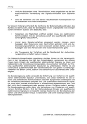 Anhang wird den Nutzenden keine "Warnfunktion" mehr angeboten wie bei der ausschließlichen Verwendung des Signaturschlüssels zum Signieren und sind die Verfahren und die daraus resultierenden Konsequenzen für die Nutzenden nicht mehr transparent. Vor diesem Hintergrund fordert die Konferenz der Datenschutzbeauftragten des Bundes und der Länder, dass der Gesetzgeber weder ungeeignete noch weniger sichere Verfahren zulässt. Dies bedeutet, dass Nutzenden die Möglichkeit eröffnet werden muss, die elektronische Kommunikation mit der Verwaltung durch eine qualifizierte elektroni- sche Signatur abzusichern, immer dann Signaturverfahren eingesetzt werden müssen, wenn Aussagen über Dokumente oder Nachrichten gefordert sind und Au- thentisierungsverfahren nur dort verwendet werden dürfen, wo es um Aussagen über eine Person oder eine Systemkomponente geht, die Transparenz der Verfahren und die Nutzbarkeit der Authentisie- rungsfunktion erhalten bleiben müssen. Die Datenschutzbeauftragten appellieren darüber hinaus an die Verantwortli- chen in der Verwaltung und bei den Projektträgern, gemeinsam die offenen Fragen beim Einsatz der qualifizierten elektronischen Signatur zu lösen und insbesondere die Entwicklung interoperabler, ökonomischer Verfahren zur Prü- fung qualifizierter elektronischer Signaturen zu unterstützen. Hierfür ist die konstruktive Zusammenarbeit der Verantwortlichen von großen Anwendungs- verfahren wie Elster Online, ELENA und Elektronische Gesundheitskarte unab- dingbar. Die Bundesregierung sollte verstärkt die Einführung von Verfahren mit qualifi- zierter elektronischer Signatur unterstützen, weil diese Verfahren für die si- chere und authentische Kommunikation zwischen Bürgerinnen und Bürgern und der Verwaltung besonders geeignet sind. Die qualifizierte elektronische Signa- tur muss eine zentrale Komponente in eGovernment-Anwendungen sein, und darf nicht durch ungeeignete oder weniger sichere Verfahren ersetzt werden. Die Bundesregierung sollte daher die Verbreitung von Chipkarten mit qualifi- ziertem Zertifikat fördern. Erst der flächendeckende Einsatz von qualifizierten elektronischen Signaturen ermöglicht niedrige Kosten bei der Bereitstellung der Karten und führt darüber hinaus zu rationellen und somit kostengünstigen Ver- waltungsabläufen. 180 LDI NRW 18. Datenschutzbericht 2007