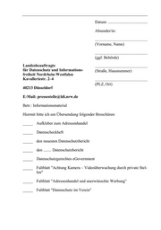 Datum: ....................................... Absender/in: .................................................... (Vorname, Name) .................................................... (ggf. Behörde) Landesbeauftragte .................................................... für Datenschutz und Informations- (Straße, Hausnummer) freiheit Nordrhein-Westfalen Kavalleriestr. 2–4 .................................................... (PLZ, Ort) 40213 Düsseldorf E-Mail: pressestelle@ldi.nrw.de Betr.: Informationsmaterial Hiermit bitte ich um Übersendung folgender Broschüren: _____ Aufkleber zum Adressenhandel _____ Datenscheckheft _____ den neuesten Datenschutzbericht _____ den ........ Datenschutzbericht _____ Datenschutzgerechtes eGovernment _____ Faltblatt "Achtung Kamera – Videoüberwachung durch private Stel- len" _____ Faltblatt "Adressenhandel und unerwünschte Werbung" _____ Faltblatt "Datenschutz im Verein"