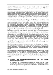 Anhang sche Identität zugewiesen, mit der sie bzw. er sich künftig auch gegenüber eGovernment-Portalen der Verwaltung oder eCommerce-Angeboten der Wirt- schaft identifizieren soll. Einheitliche Personenkennzeichen bergen erhebliche Risiken für das Recht auf informationelle Selbstbestimmung. So könnte sich aus der Steuer-ID ein Perso- nenkennzeichen entwickeln, über das alle möglichen Datenbestände personen- bezogen verknüpft und umfassende Persönlichkeitsprofile erstellt werden. An- gesichts der stetig verbesserten technischen Möglichkeiten, zunächst verteilt gespeicherte Daten anwendungsübergreifend zu verknüpfen, wachsen entspre- chende Begehrlichkeiten. Die Konferenz der Datenschutzbeauftragten des Bundes und der Länder weist darauf hin, dass die effektive Nutzung von Informationstechnik und hohe Da- tenschutzstandards keinen Widerspruch bilden. Ein datenschutzförderndes Identitätsmanagement kann den Einzelnen vor unangemessener Überwachung und Verknüpfung seiner Daten schützen und zugleich eine moderne und effek- tive Datenverarbeitung ermöglichen. Entsprechende EU-Projekte wie PRIME (Privacy and Identity Management for Europe) und FIDIS (Future of Identity in the Information Society) werden im Rahmen des 6. Europäischen Forschungs- programms "Technologien für die Informationsgesellschaft" gefördert. Identitätsmanagement sollte auf der anonymen oder pseudonymen Nutzung von elektronischen Verfahren und der dezentralen Haltung von Identifikations- daten unter möglichst weitgehender Kontrolle der betroffenen Bürgerinnen und Bürger basieren. Datenschutzfördernde Identitätsmanagementsysteme schlie- ßen Verknüpfungen nicht aus, wenn die Nutzenden es wünschen oder wenn dies gesetzlich vorgesehen ist. Sie verhindern jedoch, dass unkontrolliert der Bezug zwischen einer elektronischen Identität und einer Person hergestellt werden kann. Unter bestimmten, klar definierten Bedingungen kann mit Hilfe von Identitätsmanagementsystemen sichergestellt werden, dass ein Pseudo- nym bei Bedarf bezogen auf einen bestimmten Zweck (z.B. Besteuerung) einer Person zugeordnet werden kann. Identitätsmanagementsysteme werden nur dann die Akzeptanz der Nutzerin- nen und Nutzer finden, wenn sie einfach bedienbar sind, ihre Funktionsweise für alle Beteiligten transparent ist, möglichst alle Komponenten standardisiert sind und die Technik von unabhängigen Dritten jederzeit vollständig nachprüf- bar ist. Die Konferenz der Datenschutzbeauftragten des Bundes und der Länder fordert die Bundesregierung daher auf, den Absichtserklärungen des IT-Gipfels Taten folgen zu lassen und den Einsatz datenschutzfördernder Identitätsmanage- mentsysteme voranzutreiben. Sowohl die öffentliche Verwaltung als auch die Wirtschaft sollte die Einführung solcher datenschutzfördernder Systeme unter- stützen. Vorgaben des Bundesverfassungsgerichts bei der Online- Durchsuchung beachten 1. Die Konferenz der Datenschutzbeauftragten des Bundes und der Länder begrüßt, dass das Bundesverfassungsgericht die Regelung zur Online- Durchsuchung im Verfassungsschutzgesetz Nordrhein-Westfalen für nichtig LDI NRW 19. Datenschutzbericht 2009 169