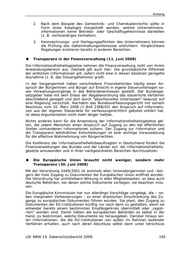 Anhang 2. Nach dem Beispiel des Gentechnik- und Chemikalienrechts sollte in Form eines Kataloges klargestellt werden, welche Unternehmens- informationen keine Betriebs- oder Geschäftsgeheimnisse darstellen (z. B. rechtswidriges Verhalten). 3. Kennzeichnungs- und Darlegungspflichten des Unternehmens können die Prüfung des Geheimhaltungsinteresses erleichtern. Vergleichbare Regelungen existieren bereits in anderen Bereichen. Transparenz in der Finanzverwaltung (11. Juni 2008) Die Informationsfreiheitsgesetze nehmen die Finanzverwaltung nicht von ihrem Anwendungsbereich aus. Deshalb gilt auch hier: Die grundsätzliche Offenheit der amtlichen Informationen gilt, sofern nicht eine in diesen Gesetzen geregelte Ausnahme (z. B. das Steuergeheimnis) greift. In der Vergangenheit haben verschiedene Finanzbehörden häufig einen An- spruch der Bürgerinnen und Bürger auf Einsicht in eigene Steuerunterlagen so- wie Verwaltungsvorgänge in das Behördenermessen gestellt. Der Bundesge- setzgeber habe mit dem Erlass der Abgabenordnung das steuerliche Verfahren abschließend geregelt und dort durch "absichtsvolles Unterlassen" bewusst auf eine Regelung verzichtet. Nachdem das Bundesverfassungsgericht mit seinem Beschluss vom 10. März 2008 (1 BvR 2388/03) den Anspruch auf Informatio- nen aus der eigenen Steuerakte für verfassungsrechtlich geboten erklärt hat, ist diese Argumentation nicht mehr länger haltbar. Nichts anderes kann für die Anwendung der Informationsfreiheitsgesetze gel- ten, die jedem Menschen einen Anspruch auf Zugang zu den bei öffentlichen Stellen vorhandenen Informationen sichern. Der Zugang zur Information und die Transparenz behördlicher Entscheidungen ist eine wichtige Voraussetzung für die effektive Wahrnehmung von Bürgerrechten. Die Konferenz der Informationsfreiheitsbeauftragten in Deutschland fordert die Finanzverwaltungen des Bundes und der Länder auf, die Informationsfreiheits- gesetze anzuwenden und in ihren nachgeordneten Bereichen durchzusetzen. Die Europäische Union braucht nicht weniger, sondern mehr Transparenz (30. Juni 2008) Mit der Verordnung 1049/2001 ist erstmals allen Unionsbürgerinnen und –bür- gern der freie Zugang zu Dokumenten der Europäischen Union eröffnet worden. Die Verordnung hat unmittelbare Wirkung in allen Mitgliedstaaten, so dass auch deutsche Behörden, bei denen solche Dokumente vorliegen, sie beachten müs- sen. Die Europäische Kommission hat nun allerdings Vorschläge vorgelegt, die – ne- ben marginalen Verbesserungen - zu einer drastischen Einschränkung des Zu- gangs zu europäischen Dokumenten führen würden. Sie plant, den Zugang zu Dokumenten der EU-Institutionen künftig nur noch dann zu gestatten, wenn sie entweder bereits einem bestimmten Empfängerkreis übermittelt oder „regist- riert“ worden sind. Damit hätten die europäischen Behörden es selbst in der Hand, zu bestimmen, welche Dokumente sie herausgeben. Darüber hinaus sol- len Informationen, die die EU-Institutionen von außen im Rahmen laufender Verfahren erhalten, auch nach deren Abschluss selbst dann unter Verschluss LDI NRW 19. Datenschutzbericht 2009 195