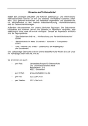 Hinweise auf Infomaterial Neben den jeweiligen aktuellen und früheren Datenschutz- und Informations- freiheitsberichten können Sie bei uns weiteres Infomaterial kostenlos anfor- dern. Dazu gehören Broschüren und Faltblätter allgemeiner und spezieller Na- tur, beispielsweise zu den Themen Videoüberwachung, Informationsfreiheit oder zu Datensicherheitsfragen. Außerdem dokumentieren wir unsere jährlichen Tagungen. Die Dokumenta- tionsbände aus früheren Jahren sind teilweise in Papierform vergriffen, aber elektronisch unter www.ldi.nrw.de verfügbar. Derzeit als Paperback erhältlich sind die Tagungsbände: • "Die Gedanken sind frei... Hirnforschung und Persönlichkeitsrechte" (2006) • "Persönlichkeit im Netz: Sicherheit – Kontrolle – Transparenz" (2007) • "GPS, Internet und Video – Datenschutz am Arbeitsplatz" (im Erscheinen) Eine vollständige Übersicht und ein Online-Bestellformular finden Sie auf unse- rer Homepage unter www.ldi.nrw.de. Sie erreichen uns auch: • per Post: Landesbeauftragte für Datenschutz und Informationsfreiheit NRW Kavalleriestr. 2-4 40213 Düsseldorf • per E-Mail: pressestelle@ldi.nrw.de • per Fax: 0211/3842410 • per Telefon: 0211/38424-0