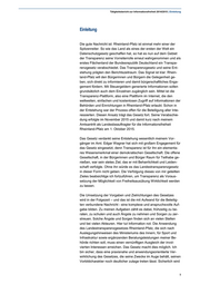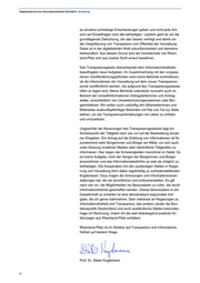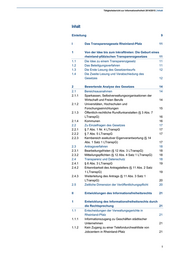 Tätigkeitsbericht zur Informationsfreiheit 2014/2015 | Inhalt Inhalt Einleitung 9 I Das Transparenzgesetz Rheinland-Pfalz 11 1 Von der Idee bis zum Inkrafttreten: Die Geburt eines rheinland-pfälzischen Transparenzgesetzes 11 1.1 Die Idee zu einem Transparenzgesetz 11 1.2 Das Beteiligungsverfahren 11 1.3 Die Erste Lesung des Gesetzentwurfs 12 1.4 Die Zweite Lesung und Verabschiedung des Gesetzes 12 2 Bewertende Analyse des Gesetzes 14 2.1 Bereichsausnahmen 14 2.1.1 Sparkassen, Selbstverwaltungsorganisationen der Wirtschaft und Freien Berufe 14 2.1.2 Universitäten, Hochschulen und Forschungseinrichtungen 15 2.1.3 Öffentlich-rechtliche Rundfunkanstalten (§ 3 Abs. 7 LTranspG) 16 2.1.4 Kommunen 16 2.2 Zu Einzelfragen des Gesetzes 17 2.2.1 § 7 Abs. 1 Nr. 4 LTranspG 17 2.2.2 § 7 Abs. 5 LTranspG 17 2.2.3 Kernbereich exekutiver Eigenverantwortung (§ 14 Abs. 1 Satz 1 LTranspG) 17 2.3 Antragsverfahren 18 2.3.1 Bearbeitungsfristen (§ 12 Abs. 3 LTranspG) 18 2.3.2 Mitteilungspflichten (§ 12 Abs. 4 Satz 1 LTranspG) 18 2.4 Transparenz und Datenschutz 18 2.4.1 § 6 Abs. 3 LTranspG 19 2.4.2 Erkennbarkeit des Antragstellers (§ 11 Abs. 2 Satz 1 LTranspG) 19 2.4.3 Weiterleitung des Antrags (§ 11 Abs. 3 Satz 1 LTranspG) 20 2.5 Zeitliche Dimension der Veröffentlichungspflicht 20 II Entwicklungen des Informationsfreiheitsrechts 21 1 Entwicklung des Informationsfreiheitsrechts durch die Rechtsprechung 21 1.1 Entscheidungen der Verwaltungsgerichte in Rheinland-Pfalz 21 1.1.1 Informationszugang zu Geschäften städtischer Unternehmen 21 1.1.2 Kein Zugang zu einer Telefondurchwahlliste von Jobcentern in Rheinland-Pfalz 21 5