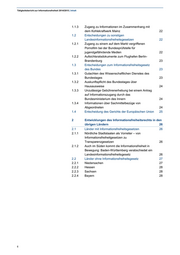Tätigkeitsbericht zur Informationsfreiheit 2014/2015 | Inhalt 1.1.3 Zugang zu Informationen im Zusammenhang mit dem Kohlekraftwerk Mainz 22 1.2 Entscheidungen zu sonstigen Landesinformationsfreiheitsgesetzen 22 1.2.1 Zugang zu einem auf dem Markt vergriffenen Pornofilm bei der Bundesprüfstelle für jugendgefährdende Medien 22 1.2.2 Aufsichtsratsdokumente zum Flughafen Berlin- Brandenburg 23 1.3 Entscheidungen zum Informationsfreiheitsgesetz des Bundes 23 1.3.1 Gutachten des Wissenschaftlichen Dienstes des Bundestages 23 1.3.2 Auskunftspflicht des Bundestages über Hausausweise 24 1.3.3 Unzulässige Gebührenerhebung bei einem Antrag auf Informationszugang durch das Bundesministerium des Innern 24 1.3.4 Informationen über Sachmittelbezüge von Abgeordneten 24 1.4 Entscheidung des Gerichts der Europäischen Union 25 2 Entwicklungen des Informationsfreiheitsrechts in den übrigen Ländern 26 2.1 Länder mit Informationsfreiheitsgesetzen 26 2.1.1 Nördliche Stadtstaaten als Vorreiter – von Informationsfreiheitgesetzen zu Transparenzgesetzen 26 2.1.2 Auch im Süden kommt die Informationsfreiheit in Bewegung: Baden-Württemberg verabschiedet ein Landesinformationsfreiheitsgesetz 26 2.2 Länder ohne Informationsfreiheitsgesetz 27 2.2.1 Niedersachen 27 2.2.2 Hessen 28 2.2.3 Sachsen 28 2.2.4 Bayern 28 6