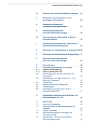 Tätigkeitsbericht zur Informationsfreiheit 2014/2015 | Inhalt III Konferenz der Informationsfreiheitsbeauftragten 29 1 Die Konferenz der Informationsfreiheits beauftragten in Deutschland 29 2 Europäische Konferenz der Informationsfreiheitsbeauftragten 33 3 Internationale Konferenz der Informationsfreiheitsbeauftragten 34 IV Schwerpunkte der Arbeit des LfDI im Bereich Informationsfreiheit 35 1 Erarbeitung eines Leitfadens für die Praxis zum Landesinformationsfreiheitsgesetz 35 2 Einführung von „Frag den Staat“ in Rheinland-Pfalz 36 3 Schulungen des Informationsfreiheitsbeauftragten 37 4 Informationsveranstaltungen des Informationsfreiheitsbeauftragten 38 5 Veranstaltungen 39 5.1 Kooperationsveranstaltungen und Vorträge 39 5.1.1 Speyerer Demokratietagung 39 5.1.2 Institut für Rechtspolitik Trier 39 5.2 Podiumsdiskussion „Gründe und Grenzen der Transparenz“ 39 5.3 Veranstaltungen zum Right to Know Day – „Vom Nutzen der Transparenz“ 40 5.4 Coding Camp 40 5.4 Besuche ausländischer Delegationen 41 5.5 Verfassungsfest 41 5.6 Veranstaltung „Alle Jahre wieder: Best of Informationsfreiheit 2015“ 41 V Ausgewählte Ergebnisse aus der Prüfungs- und Beratungstätigkeit des LfDI 42 1 Kommunales 42 1.1 Anonyme Antragsstellung 42 1.2 Antrag auf Zugang zu Gestattungsverträgen für Windparks 43 1.3 Zugang zu Bauakten 43 1.4 Keine Beschaffungspflicht bei Anträgen auf Informationszugang 44 1.5 Schuldenerlass – Schutz des behördlichen Entscheidungsprozesses 45 7