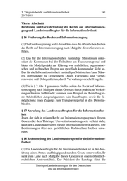 3. Tätigkeitsbericht zur Informationsfreiheit 241 2017/2018 Vierter Abschnitt Förderung und Gewährleistung des Rechts auf Informationszu- gang und Landesbeauftragter für die Informationsfreiheit § 16 Förderung des Rechts auf Informationszugang (1) Die Landesregierung wirkt darauf hin, dass die öffentlichen Stellen das Recht auf Informationszugang nach Maßgabe dieses Gesetzes er- füllen. (2) Das für die Informationsfreiheit zuständige Ministerium unter- stützt die Kommunen bei der Teilnahme am Transparenzportal und bietet ein Modellprojekt zur Klärung von rechtlichen, organisatori- schen und technischen Fragen aus spezifisch kommunaler Sicht an. Das für die Informationsfreiheit zuständigen Ministerium kann Nähe- res, insbesondere zu Teilnehmern, Dauer, Vorgehens- und Verfah- rensweise und Obliegenheiten, durch Verwaltungsvorschrift regeln. (3) Die in § 2 Abs. 1 genannten Stellen sollen das Recht auf Informa- tionszugang nach Maßgabe dieses Gesetzes durch praktische Vorkeh- rungen fördern. In Betracht kommen zum Beispiel die Bestellung ei- nes behördlichen Ansprechpartners oder Beauftragten sowie die Er- möglichung eines Zugangs zum Transparenzportal in den Dienstge- bäuden. § 17 Anrufung des Landesbeauftragten für die Informationsfrei- heit Jeder, der sich in seinem Recht auf Informationszugang nach diesem Gesetz oder dem Thüringer Umweltinformationsgesetz verletzt sieht, kann den Landesbeauftragten für die Informationsfreiheit anrufen. Die Bestimmungen über den gerichtlichen Rechtsschutz bleiben unbe- rührt. § 18 Rechtsstellung des Landesbeauftragten für die Informations- freiheit (1) Der Landesbeauftragte für die Informationsfreiheit ist in der Aus- übung seines Amtes unabhängig und nur dem Gesetz unterworfen. Er steht zum Land nach Maßgabe dieses Gesetzes in einem öffentlich- rechtlichen Amtsverhältnis. Der Präsident des Landtags führt die Thüringer Landesbeauftragter für den Datenschutz und die Informationsfreiheit
