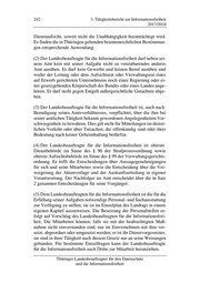 242 3. Tätigkeitsbericht zur Informationsfreiheit 2017/2018 Dienstaufsicht, soweit nicht die Unabhängigkeit beeinträchtigt wird. Es finden die in Thüringen geltenden beamtenrechtlichen Bestimmun- gen entsprechende Anwendung. (2) Der Landesbeauftragte für die Informationsfreiheit darf neben sei- nem Amt kein mit seiner Aufgabe nicht zu vereinbarendes anderes Amt ausüben. Er darf kein Gewerbe und keinen Beruf ausüben und weder der Leitung oder dem Aufsichtsrat oder Verwaltungsrat eines auf Erwerb gerichteten Unternehmens noch einer Regierung oder ei- ner gesetzgebenden Körperschaft des Bundes oder eines Landes ange- hören. Er darf nicht gegen Entgelt außergerichtliche Gutachten abge- ben. (3) Der Landesbeauftragte für die Informationsfreiheit ist, auch nach Beendigung seines Amtsverhältnisses, verpflichtet, über die ihm bei seiner amtlichen Tätigkeit bekannt gewordenen Angelegenheiten Ver- schwiegenheit zu bewahren. Dies gilt nicht für Mitteilungen im dienst- lichen Verkehr oder über Tatsachen, die offenkundig sind oder ihrer Bedeutung nach keiner Geheimhaltung bedürfen. (4) Der Landesbeauftragte für die Informationsfreiheit ist oberste Dienstbehörde im Sinne des § 96 der Strafprozessordnung sowie oberste Aufsichtsbehörde im Sinne des § 99 der Verwaltungsgerichts- ordnung. Er trifft die Entscheidungen über Aussagegenehmigungen für sich und seine Mitarbeiter sowie die Entscheidung über die Ver- weigerung der Aktenvorlage und der Auskunftserteilung in eigener Verantwortung. Der Nachfolger im Amt entscheidet über die in Satz 2 genannten Entscheidungen für seine Vorgänger. (5) Dem Landesbeauftragten für die Informationsfreiheit ist die für die Erfüllung seiner Aufgaben notwendige Personal- und Sachausstattung zur Verfügung zu stellen; sie ist im Einzelplan des Landtags in einem eigenen Kapitel auszuweisen. Die Besetzung der Personalstellen er- folgt auf Vorschlag des Landesbeauftragten für die Informationsfrei- heit. Die Mitarbeiter können, falls sie mit der beabsichtigten Maß- nahme nicht einverstanden sind, nur im Einvernehmen mit ihm ver- setzt, abgeordnet oder umgesetzt werden; er ist ihr Dienstvorgesetzter, sie sind in ihrer Tätigkeit nach diesem Gesetz nur an seine Weisungen gebunden. Für bestimmte Einzelfragen kann der Landesbeauftragte für die Informationsfreiheit auch Dritte zur Mitarbeit heranziehen. Thüringer Landesbeauftragter für den Datenschutz und die Informationsfreiheit