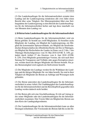 244 3. Tätigkeitsbericht zur Informationsfreiheit 2017/2018 (3) Der Landesbeauftragte für die Informationsfreiheit erstattet dem Landtag und der Landesregierung mindestens alle zwei Jahre einen Bericht über seine Tätigkeit. Der Ministerpräsident führt eine Stel- lungnahme der Landesregierung zu dem Bericht des Landesbeauftrag- ten für die Informationsfreiheit herbei und legt diese innerhalb von vier Monaten dem Landtag vor. § 20 Beirat beim Landesbeauftragten für die Informationsfreiheit (1) Beim Landesbeauftragten für die Informationsfreiheit wird ein Beirat gebildet. Er besteht aus zwölf Mitgliedern. Es bestellen sechs Mitglieder der Landtag, ein Mitglied die Landesregierung, ein Mit- glied die kommunalen Spitzenverbände, ein Mitglied die berufsstän- dischen Körperschaften des öffentlichen Rechts mit Sitz in Thüringen, ein Mitglied die Hochschulen des Landes im Sinne von § 2 Abs. 1 des Thüringer Hochschulgesetzes vom 10. Mai 2018 (GVBl. S. 149), ge- ändert durch Artikel 27 des Gesetzes vom 6. Juni 2018 (GVBl. S. 229). Zwei Mitglieder gemeinnütziger Vereine, die sich nach ihrer Satzung für Transparenz und Teilhabe oder gegen Korruption einset- zen, werden durch die übrigen Mitglieder des Beirats bestellt. Für je- des Beiratsmitglied wird zugleich ein Stellvertreter bestellt. (2) Die Mitglieder des Landtags werden für die Wahldauer des Land- tags und die übrigen Mitglieder für vier Jahre bestellt. Sie sind in ihrer Tätigkeit als Mitglieder des Beirats an Aufträge und Weisungen nicht gebunden. (3) Der Beirat unterstützt den Landesbeauftragten für die Informati- onsfreiheit in seiner Arbeit. Die Unabhängigkeit des Landesbeauftrag- ten für die Informationsfreiheit und die Berichtspflicht gegenüber dem Landtag werden dadurch nicht berührt. (4) Der Beirat gibt sich eine Geschäftsordnung. Er tritt auf Antrag je- des seiner Mitglieder oder des Landesbeauftragten für die Informati- onsfreiheit zusammen. Den Vorsitz führt ein Mitglied des Beirats aus dem Kreis der Landtagsabgeordneten. (5) Der Landesbeauftragte für die Informationsfreiheit kann an allen Sitzungen teilnehmen. Der Vorsitzende des Beirats lädt ihn zu den Sit- Thüringer Landesbeauftragter für den Datenschutz und die Informationsfreiheit