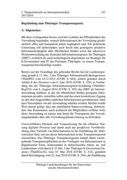 3. Tätigkeitsbericht zur Informationsfreiheit 247 2017/2018 Begründung zum Thüringer Transparenzgesetz A. Allgemeines Mit dem vorliegenden Gesetz wird die Leitlinie der Öffentlichkeit der Verwaltung begründet, wonach Informationen der Verwaltung grund- sätzlich offen und transparent jedem zugänglich sind. Die praktische Umsetzung soll insbesondere auch durch eine gesteigerte proaktive Informationstätigkeit aller öffentlichen Stellen sowie die sukzessive Weiterentwicklung des Zentralen Informationsregisters für Thüringen (ZIRT), rechtlich als auch technologisch abgestimmt zur Strategie für E-Government und IT des Freistaats Thüringen, zu einem Transpa- renzportal bewerkstelligt werden. Bereits auf der Grundlage des geltenden Rechts hat die Landesregie- rung gemäß § 11 Abs. 3 des Thüringer Informationsfreiheitsgesetzes (ThürIFG) vom 14.12.2012 (GVBl. S. 464), zuletzt geändert durch Artikel 8 des Gesetzes vom 6. Juni 2018 (GVBl. S. 229) in Verbin- dung mit der Thüringer Informationsregisterverordnung (ThürInfo- RegVO) vom 6. August 2014 (GVBl. S. 582) das ZIRT als Internet- anwendung etabliert, in das die öffentlichen Stellen geeignete Infor- mationen proaktiv einstellen sollen und das einen kostenlosen Zugang zu den dort eingestellten amtlichen Informationen gewährleistet, ohne dass Nutzerdaten von der Anwendung erhoben werden. Hierbei wurde Wert darauf gelegt, dass der mittelbaren Staatsverwaltung, insbeson- dere den Kommunen, auch technisch die Möglichkeit eröffnet wird, diese Anwendung zu nutzen und damit die Transparenz des Verwal- tungshandelns über alle Verwaltungsebenen hinweg zu befördern. Unverzichtbares Element und Voraussetzung für die effektive Nut- zung digitaler Prozesse und damit auch der proaktiven Veröffentli- chung einer Vielzahl von Informationen ist die Einführung der elekt- ronischen Akte, um aus dieser Informationen in das Transparenzportal einzustellen. Das Thüringer Transparenzgesetz knüpft daher weiter- gehende Transparenzpflichten an das Vorliegen von Informationen in digitalisierter Form, insbesondere in elektronischen Akten, an. Auf Landesebene wird durch § 15 Abs. 3 des Thüringer E-Goverment-Ge- setzes (ThürEGovG) vom 10. Mai 2018 (GVBl. S. 212), geändert durch Berichtigung vom 22. Juni 2018 (GVBl. S. 294), die Einführung Thüringer Landesbeauftragter für den Datenschutz und die Informationsfreiheit