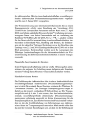 246 3. Tätigkeitsbericht zur Informationsfreiheit 2017/2018 § 24 Übergangsbestimmung (1) Für Anträge auf Zugang zu amtlichen Informationen, die vor dem Inkrafttreten dieses Gesetzes gestellt worden sind, finden die bis dahin geltenden Vorschriften Anwendung. (2) Das für die Koordinierung der ressortübergreifenden Informa- tions- und Kommunikationstechnik zuständige Ministerium 1. unterrichtet den für Informationsfreiheit zuständigen Ausschuss des Landtags jährlich zum Umsetzungsstand der Einführung des landeseinheitlichen ressortübergreifenden elektronischen Doku- mentenmanagementsystems und 2. gibt den Tag, an dem das landeseinheitliche ressortübergreifende elektronische Dokumentenmanagementsystem nach § 6 Abs. 3 Satz 1 vollständig ausgerollt wurde, im Gesetz- und Verord- nungsblatt für den Freistaat Thüringen bekannt. (3) Die Transparenzpflicht gilt für Informationen nach § 6 Abs. 3 Nr. 2 auch, soweit sie durch Migration von bestehenden Dokumentenma- nagementsystemen in das landeseinheitliche ressortübergreifende elektronische Dokumentenmanagementsystem aufgenommenen wer- den und zum Zeitpunkt der Einführung des ressortübergreifenden elektronischen Dokumentenmanagementsystems bei der öffentlichen Stelle noch Rechtswirkungen entfalten. Die Transparenzpflicht ist durch Einstellung der Information in das Transparenzregister im vor- handenen Format erfüllt. (4) Das für die Informationsfreiheit zuständige Ministerium unterrich- tet den für die Informationsfreiheit zuständigen Ausschuss des Land- tags jährlich zum Modellprojekt nach § 16 Abs. 2. § 25 Inkrafttreten, Außerkrafttreten (1) § 20 tritt am 1. Januar 2020 in Kraft. Im Übrigen tritt dieses Gesetz am 1. Januar 2019 in Kraft. (2) Gleichzeitig mit dem Inkrafttreten dieses Gesetzes nach Absatz 1 Satz 2 tritt das Thüringer Informationsfreiheitsgesetz vom 14. Dezem- ber 2012 (GVBl. S. 464), zuletzt geändert durch Artikel 8 des Geset- zes vom 6. Juni 2018 (GVBl. S. 229), außer Kraft. Thüringer Landesbeauftragter für den Datenschutz und die Informationsfreiheit