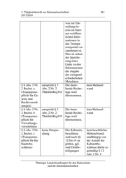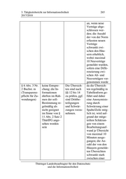 3. Tätigkeitsbericht zur Informationsfreiheit 265 2017/2018 an, wenn neue Verträge abge- schlossen wer- den; die Anzahl der von der Norm erfassten neuen Verträge schwankt zwi- schen den Häu- sern erheblich, wobei maximal 10 Neuverträge gemeldet wurden, sofern eine Diffe- renzierung zwi- schen Alt- und Neuverträgen vor- genommen wurde § 6 Abs. 3 Nr. keine Entspre- Die Übersich- da die Übersich- 2 Buchst. m chung; die In- ten sind nach ten regelmäßig in (Transparenz- formationen §§ 12 bis 14 Tabellenform ge- pflicht für Zu- dürften im Rah- zu prüfen, ggf. führt und daher wendungen) men der soll- sind Drittbe- eine Anonymisie- Bestimmung re- teiligungen rung durch gelmäßig als und Schwär- Schwärzung einer nicht geeignet zungen vorzu- Spalte/Zeile mög- im Sinne von § nehmen. lich ist, wird auf- 11 Abs. 2 Satz 2 grund der mitge- ThürIFG ange- teilten Schätzun- sehen worden gen von einem sein Bearbeitungsauf- wand je Übersicht von maximal 10 Minuten ausge- gangen; die An- zahl der von den Häusern gemelde- ten Übersichten schwankt stark zwischen einer Thüringer Landesbeauftragter für den Datenschutz und die Informationsfreiheit