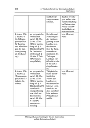 3. Tätigkeitsbericht zur Informationsfreiheit 263 2017/2018 § 6 Abs. 3 Nr. als geeignete In- Mit Ausnahme im Rahmen der 2 Buchst. h formationen der Anlagen Rückmeldungen (Transparenz- sind entspre- wird die beste- wurde ein Fall mit pflicht für in chen-de Be- hende Rechts- einem geschätzten öffentlicher schlüsse nach § lage übernom- Aufwand von 240 Sitzung ge- 11 Abs. 2 Satz 2 men. Die An- Minuten im Jahr fasste Be- ThürIFG in Ver- lagen sind auf gemeldet schlüsse nebst bindung mit § 3 die Verfü- Protokollen ThürInfoRegVO gungsbefugnis und Analgen) veröffentli- und nach chungspflichtig §§ 12 bis 14 bzw. für Lan- zu prüfen, ggf. desbehörden sind Drittbe- nach § 11 Abs. teiligungen 3 ThürIFG und Schwär- transparenz- zungen vorzu- pflichtig nehmen. § 6 Abs. 3 Nr. als geeignete In- Die erfassten kein Mehrauf- 2 Buchst. i formationen Informationen wand (Transparenz- nach § 11 Abs. sind bereits pflicht für 2 Satz 2 Thü- nach den Vor- Umwelt-in- rIFG in Verbin- gaben des formationen) dung mit § 3 ThürUIG zu ThürInfoRegVO veröffentli- veröffentli- chen, so dass chungspflichtig weitergehende bzw. für Lan- Prüfungen ent- desbehörden fallen und nur nach § 11 Abs. die Einstel- 3 ThürIFG lung in das transparenz- Transparenz- pflichtig portal erfor- derlich ist. § 6 Abs. 3 Nr. entspricht § 3 Das Landes- kein Mehrauf- 2 Buchst. j Abs. 2 Nr. 4 amt für Statis- wand (Transparenz- ThürInfoRegVO tik stellt schon pflicht für heute die Sta- amtliche Sta- tistiken über tistiken) das eigene In- Thüringer Landesbeauftragter für den Datenschutz und die Informationsfreiheit