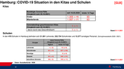 Hamburg: COVID-19 Situation in den Kitas und Schulen [GLB] Kitas Bestätigte Corona-Fälle seit 16.03.2020 letzte 14 Tage (Vergleich zum 25.10.2021) Kinder 1.305 (+ 49) 93 Mitarbeitende 1.557 (+ 27) 63 Coronabedingt geschlossenen Kitas (Vergleich zum 25.10.2021) 1 (+ 1) davon durch das Gesundheitsamt 1 (+ 1) Stand 01.11.2021 Schulen In den 470 Schulen in Hamburg befinden sich 21.591 Lehrende, 252.734 Schulkinder und 13.377 sonstiges Personal. (Schuljahresstatistik 2020 / 2021) neue Corona-Fälle Gruppe (Vergleich zum 25.10.2021) täglich letzte 10 Tage Lehrende 1 (- 3) 13 (+ 4) Schulkinder 62 (+ 9) 327 (+ 83) Sonstige 1 6 (+ 4) Gesamt 64 (+ 6) 346 (+ 91) betroffene Schulen 39 (- 3) 153 (+ 11) Stand 01.11.2021 Daten: Sozialbehörde / BSB 32
