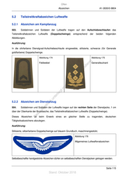 Offen Abzeichen A1-2630/0-9804 5.2 Teilstreitkraftabzeichen Luftwaffe 5.2.1 Abzeichen am Kampfanzug 503. Soldatinnen und Soldaten der Luftwaffe tragen auf den Aufschiebeschlaufen das Teilstreitkraftabzeichen Luftwaffe (Doppelschwinge) entsprechend der beiden folgenden Abbildungen. Ausführung: In die olivfarbene Dienstgrad-Aufschiebeschlaufe eingewebte, stilisierte, schwarze (für Generale goldfarbene) Doppelschwinge. Abbildung 174 Abbildung 175 st Feldwebel en Generalleutnant sd i ng ru de Än m de ht ic tn eg rli te un 5.2.2 Abzeichen am Dienstanzug k uc dr 504. us Soldatinnen und Soldaten der Luftwaffe tragen auf der rechten Seite der Dienstjacke, 1 cm rA über der Oberkante der Brusttasche, das Teilstreitkraftabzeichen Luftwaffe (Doppelschwinge). se ie Dieses Abzeichen D ist beim Erwerb eines an gleicher Stelle zu tragenden, deutschen Tätigkeitsabzeichens abzulegen. Ausführung: Stilisierte, silberfarbene Doppelschwinge auf blauem Grundtuch, maschinengestickt. Abbildung 176 Allgemeines Luftwaffenabzeichen Selbstbeschaffte handgestickte Abzeichen dürfen an selbstbeschafften Dienstjacken getragen werden. Seite 115 Stand: Oktober 2018