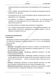 Offen A1-2630/0-9804 Abzeichen d) Ergänzende Tragebestimmungen • Soldatinnen und Soldaten des Ausbildungsstützpunkts Luftlande/Lufttransport tragen das bordeauxrote Barett; • Soldatinnen und Soldaten der Panzer- und Heeresaufklärungstruppe innerhalb der Gebirgs- jägerbrigade 23 und des Ausbildungsstützpunkts Gebirgs- und Winterkampf tragen das Barett ihrer Truppengattung; • Soldatinnen und Soldaten der Gebirgsjägertruppe, die nicht in der Gebirgsjägerbrigade 23, im Gebirgsmusikkorps, im Bundesministerium der Verteidigung, in Kommandobehörden, Ämtern, Schulen, Landeskommandos und integrierten Stäben eingesetzt sind, tragen das grüne Barett mit dem Abzeichen der Jägertruppe; • st Soldatinnen und Soldaten des Sanitätsdienstes tragen das kobaltblaue Barett der en Sanitätstruppe (außer in der Division Schnelle Kräfte und der Gebirgsjägerbrigade 23); sd i ng • Soldatinnen und Soldaten des Ausbildungsmusikkorps der Bundeswehr tragen das korallenrote ru Barett; de Än • m Soldatinnen und Soldaten des Stabsmusikkorps der Bundeswehr, des Musikkorps der de Bundeswehr, des Heeresmusikkorps Kassel und des Heeresmusikkorps Neubrandenburg ht ic tragen das grüne Barett; tn eg • Soldatinnen und Soldaten des Heeresmusikkorps Hannover, des Heeresmusikkorps Ulm und rli te der Big Band der Bundeswehr tragen das schwarze Barett; un k • uc Soldatinnen und Soldaten des Heeresmusikkorps Koblenz und des Heeresmusikkorps dr us Veitshöchheim tragen das bordeauxrote Barett; rA • se Offizieranwärter und Offiziere des Truppendienstes bis zum Studienabschluss tragen das ie marineblaue Barett mit dem Barettabzeichen ihrer Truppengattung. D • Offizieranwärter/Reserveoffizieranwärter SaZ 3 des Truppendienstes ohne Studium tragen bis zum Abschluss des Offizierlehrgangs (OL) 1 das marineblaue Barett mit dem Barettabzeichen ihrer Truppengattung. Mit Fortsetzen der Ausbildung im Regelausbildungsgang (OL 2 oder OL 3) wird das Barett in der Farbe der Truppengattung getragen. • Reserveoffizieranwärter SAZ 2 tragen von Beginn an das Barett ihrer Truppengattung. • Feldwebel- und Unteroffizieranwärter (FA und UA) tragen in den ersten sechs Monaten ihrer Ausbildungszeit bzw. bis zum erfolgreichen Abschluss der Ausbildung im FA/UA-Bataillon das marineblaue Barett mit dem Barettabzeichen ihrer Truppengattung. Schließt sich an diese Ausbildung eine Zivil-berufliche Aus- und Weiterbildung an, so ist für die Dauer dieser Seite 164 Stand: Oktober 2018