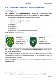 Offen Abzeichen A1-2630/0-9804 5.13 Ausländische, binationale und multinationale Abzeichen 5.13.1 Allgemeines 590. Verbands- und Dienststellenabzeichen ausländischer bi-/multinationaler Stäbe, 129 Kommandobehörden und Dienststellen dürfen auf der Falte bzw. Mitte der rechten Brusttasche + an der Dienstjacke, basaltgrau/blau/dunkelblau/weiß und sandfarben, + an der Schibluse, + an der Feldbluse bzw. Feldjacke, Tarndruck 130 , + an der Fliegerkombination 130 , + am Diensthemd, + an der Dienstbluse, st + am Bordhemd und en + an entsprechender Stelle am Jackett des Gesellschaftsanzuges sd i ng als Brustanhänger getragen werden 131 . ru de Beispiele: Än m Abbildung 458 de Abbildung 459 ht (hier: Allied Command ic (hier: Joint Force tn Operations (ACO), eg Command (JFC) rli Mons, Belgien) te Brunssum, Niederlande) un k uc dr us 591. Sofern die Verbands- und Dienststellenabzeichen Ärmelabzeichen sind, werden diese auf rA se dem rechten Oberärmel getragen 131 . ie D 592. Die Berechtigung zum Tragen dieser Abzeichen und ihre Trageweise ergeben sich aus den jeweiligen Bestimmungen des Stabes, der Kommandobehörde bzw. der Dienststelle und sind auf die Dauer der Zugehörigkeit beschränkt. Soldatinnen und Soldaten des Heeres tragen die nationalen Verbandsabzeichen gemäß Nr. 528 am Dienstanzug weiter. 129 Bei Dienstjacken ohne aufgesetzte Taschen an gleicher Stelle, ggf. als Ansteckabzeichen. 130 Befestigungsknopf ist selbst anzubringen. 131 Sind im Einsatzfall bzw. bei entsprechender Alarmstufe zu entfernen (Ausnahme NRF / EUBG). Seite 221 Stand: Oktober 2018