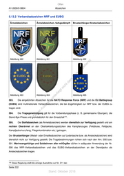 Offen A1-2630/0-9804 Abzeichen 5.13.2 Verbandsabzeichen NRF und EUBG Ärmelabzeichen Ärmelabzeichen, farbgedämpft Brustanhänger/Ansteckabzeichen Abbildung 460 Abbildung 461 Abbildung 462 st en sd i ng ru de Än m de ht ic tn eg rli Abbildung 463 Abbildung 464 te Abbildung 465 un 593. Die eingeführten Abzeichen für die NATO Response Force (NRF) und die EU Battlegroup k uc (EUBG) sind multinationale Verbandsabzeichen, die bei Zugehörigkeit zur NRF bzw. der EUBG zu dr tragen sind. us rA 594. se Die Tragegenehmigung gilt für die Vorbereitungsphase (z. B. gemeinsame Übungen), die ie D Stand-Bye-Phase und grundsätzlich für den Einsatzfall 132 . 595. Die Stoffabzeichen (als Ärmelabzeichen) werden dienstlich zur Verfügung gestellt und am rechten Oberärmel an den Oberbekleidungsstücken des Kampfanzuges (Feldbluse, Feldjacke, Kampfjacke kurz/lang, Fliegerkombination etc.) getragen. Der Brustanhänger (Metall- oder Emailleabzeichen auf Lederlasche bzw. als Ansteckabzeichen) wird dienstlich nicht zur Verfügung gestellt. Die Tragebestimmungen richten sich nach den Nrn. 590 bzw. 591. Marineangehörige und Soldatinnen aller milOrgBer dürfen in adäquater Anwendung der Nr. 590 das NRF-Verbandsabzeichen und das EUBG-Verbandsabzeichen an der Dienstjacke als Ansteckabzeichen tragen. 132 Diese Regelung stellt die einzige Ausnahme zur Nr. 211 dar. Seite 222 Stand: Oktober 2018
