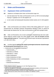 Offen A1-2630/0-9804 Orden und Ehrenzeichen 6 Orden und Ehrenzeichen 6.1 Zugelassene Orden und Ehrenzeichen 601. Soldatinnen und Soldaten dürfen Orden und Ehrenzeichen tragen, die • nach dem Gesetz über Titel, Orden und Ehrenzeichen vom 26. Juli 1957 (in der aktuell gültigen 136 Fassung) zugelassen und in Nr. 604 aufgeführt und • von den Ländern der Bundesrepublik Deutschland verliehen werden und in Nr. 605 aufgeführt sind. st 137 602. Orden und Ehrenzeichen, die im Zeittraum 1933 bis 1945 verliehen worden sind , wie auch en 138 Auszeichnungen der ehemaligen Deutschen Demokratischen Republik sd , dürfen nur gemäß der i ng Bestimmungen des Gesetzes über Titel, Orden und Ehrenzeichen an der Uniform getragen werden. ru de Än 603. m Orden und Ehrenzeichen, die von einem ausländischen Staatsoberhaupt oder einer auslän- de dischen Regierung verliehen worden sind, dürfen getragen werden, wenn die Annahme und das ht Tragen genehmigt worden ist. 139 ic Das gleiche gilt für Auszeichnungen internationaler Organisationen tn (z. B. UNO, NATO, WEU). eg rli te un k 604. Es dürfen folgende staatliche oder staatlich genehmigten/anerkannten Auszeichnungen uc dr der Bundesrepublik Deutschland getragen werden: us rA • Verdienstorden der Bundesrepublik Deutschland 140 se + Verdienstmedaille, ie D + Verdienstkreuz am Bande, + Verdienstkreuz 1. Klasse, + Großes Verdienstkreuz, + Großes Verdienstkreuz mit Stern, + Großes Verdienstkreuz mit Stern und Schulterband, + Großkreuz, + Sonderstufe des Großkreuzes. 136 Siehe „Gesetze im Internet - Spiegelung von Juris“ (über Regelungen-Online). 137 Ausgenommen Bandenkampfabzeichen. 138 Sofern sie nicht gegen den „ordre public“ der Bundesrepublik Deutschland verstoßen und für die durch das Bundespräsidialamt eine positive Einzelfallprüfung durchgeführt wurde. 139 Siehe dazu Zentralerlass B-2630/4 „Annahme und Tragen ausländischer Orden und Ehrenzeichen...“. 140 Nach Verleihung einer höheren Stufe braucht die niedrigere nicht abgelegt zu werden. Seite 224 Stand: Oktober 2018