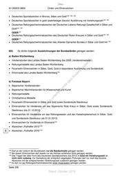 Offen A1-2630/0-9804 Orden und Ehrenzeichen • Deutsches Sportabzeichen in Bronze, Silber und Gold 144, 145, 146 • Deutsches Sportabzeichen in gold-/platinfarbiger (bicolor) Ausführung mit Verleihungszahl 144, 146 • Deutsches Rettungsschwimmabzeichen der Deutschen Lebens-Rettungs-Gesellschaft in Silber und 144, 145 Gold 147 ODER • Deutsches Rettungsschwimmabzeichen des Deutschen Roten Kreuzes in Silber und Gold 144, 145 147 ODER • Deutsches Rettungsschwimmabzeichen des Arbeiter-Samariter-Bundes in Silber und Gold144 , 145 605. Es dürfen folgende Auszeichnungen der Bundesländer getragen werden: a) Baden-Württemberg • Verdienstorden des Landes Baden-Württemberg (bis 2009 „Verdienstmedaille“) st • Rettungsmedaille des Landes Baden-Württemberg en sd i • Feuerwehr-Ehrenzeichen in Silber, Gold, Gold in besonderer Ausführung und Sonderstufe ng ru • Ehrennadel des Landes Baden-Württemberg 144 de Än m b) Freistaat Bayern de • Bayerischer Verdienstorden ht ic tn • Bayerischer Maximiliansorden für Wissenschaft und Kunst eg • Rettungsmedaille rli te • Christopherus-Medaille un k • Feuerwehr-Ehrenzeichen in Silber und Gold sowie Sonderstufe Steckkreuz uc dr • Ehrenzeichen für Verdienste um das Bayerische Rote Kreuz in Silber, Gold sowie Sonderstufe us rA Steckkreuz (bis 31.12.2012) se • Ehrenzeichen für Verdienste um das Rettungswesen und den Katastrophenschutz in Silber, Gold ie D und Sonderstufe Steckkreuz (ab 01.01.2013) • Ehrenzeichen für Verdienste im Ehrenamt 144 • Abzeichen „Fluthelfer 2013“ 144 Ä • Abzeichen „Fluthelfer 2016“ 144 144 Darf an der Uniform der Bundeswehr nur als Bandschnalle getragen werden. 145 Bei diesen Ehrenzeichen darf jeweils nur die höchste verliehene Stufe getragen werden. 146 Das Tragen der alten Form des Deutschen Sportabzeichens (bis 2012) in Gold mit Verleihungszahl ist nicht mehr zulässig. Zur Darstellung der erfolgreich abgelegten Prüfungen darf nur noch das bicolore Abzeichen mit der entsprechenden Verleihungszahl zusätzlich getragen werden. 147 Es darf nur ein Rettungsschwimmabzeichen einer Organisation getragen werden. Seite 226 Stand: Oktober 2018