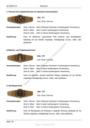 A2-2630/0-0-5 Abzeichen l) Personal des Aufgabenbereichs für Operative Kommunikation Abb.: 371 (hier: Stufe I, Bronze) Voraussetzungen: Stufe I, Bronze: Nach 6 Monaten Dienstzeit in fachbezogener Verwendung. Stufe II, Silber: Nach 5 Jahren fachbezogener Verwendung. Stufe III, Gold: Nach 10 Jahren fachbezogener Verwendung. Ausführung: Kreis mit stilisiertem, gewundenen Pfeil zwischen zwei Schrägbalken, beidseitig mit vier Streifen eingefasst, metallgeprägt; bronze-, silber- oder goldfarben. st en sd i m) Raketen- und Flugkörperpersonal ng ru de Abb.: 372 Än m de (hier: Stufe I, Bronze) ht ic tn Voraussetzungen: Stufe I, Bronze: Nach 6 Monaten Dienstzeit in fachbezogener Verwendung. eg Stufe II, Silber: rli Nach 5 Jahren fachbezogener Verwendung. te Stufe III, Gold: un Nach 10 Jahren fachbezogener Verwendung. k Ausführung: uc Kreis mit stilisierter, aufrecht stehender Rakete, beidseitig mit vier Streifen dr us eingefasst, metallgeprägt; bronze-, silber- oder goldfarben. rA se ie n) Sanitätspersonal D Abb.: 373 (hier: Stufe I, Bronze) Voraussetzungen: Stufe I, Bronze: Nach 6 Monaten Dienstzeit in fachbezogener Verwendung. Stufe II, Silber: Nach 5 Jahren fachbezogener Verwendung. Stufe III, Gold: Nach 10 Jahren fachbezogener Verwendung. Ausführung: Kreis mit Äskulapstab und Schlange in doppelter Windung, beidseitig mit vier Streifen eingefasst, metallgeprägt; bronze-, silber- oder goldfarben. Seite 178 Stand: Oktober 2016