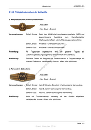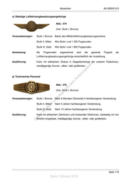 Abzeichen A2-2630/0-0-5 o) Ständige Luftfahrzeugbesatzungsangehörige Abb.: 374 (hier: Stufe I, Bronze) Voraussetzungen: Stufe I, Bronze: Besitz des Militärluftfahrzeugbesatzungsscheins. Stufe II, Silber: Wie Stufe I und 1 200 Flugstunden. Stufe III, Gold: Wie Stufe I und 1 800 Flugstunden. Anmerkung: Als Flugstunden angerechnet wird die gesamte Flugzeit als Luftfahrzeugbesatzungsangehörige einschließlich der Ausbildung. Ausführung: Kreis mit stilisiertem Globus in Doppelschwinge mit unterem Federkranz, st metallgeprägt; bronze-, silber- oder goldfarben. en sd i ng ru p) Technisches Personal de Än m Abb.: 375 de ht ic (hier: Stufe I, Bronze) tn eg rli Voraussetzungen: te Stufe I, Bronze: Nach 6 Monaten Dienstzeit in fachbezogener Verwendung. un k Stufe II, Silber: Nach 5 Jahren fachbezogener Verwendung. uc dr Stufe III, Gold: us Nach 10 Jahren fachbezogener Verwendung. rA Ausführung: Kreis mit stilisiertem Zahnkranz und kreisenden Elektronen, beidseitig mit vier se ie Streifen eingefasst, metallgeprägt; bronze-, silber- oder goldfarben. D Seite 179 Stand: Oktober 2016
