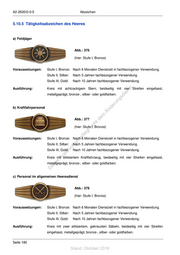A2-2630/0-0-5 Abzeichen 5.10.5 Tätigkeitsabzeichen des Heeres a) Feldjäger Abb.: 376 (hier: Stufe I, Bronze) Voraussetzungen: Stufe I, Bronze: Nach 6 Monaten Dienstzeit in fachbezogener Verwendung. Stufe II, Silber: Nach 5 Jahren fachbezogener Verwendung. Stufe III, Gold: Nach 10 Jahren fachbezogener Verwendung. Ausführung: Kreis mit achtzackigem Stern, beidseitig mit vier Streifen eingefasst, st en metallgeprägt; bronze-, silber- oder goldfarben. sd i ng ru b) Kraftfahrpersonal de Än m Abb.: 377 de ht ic (hier: Stufe I, Bronze) tn eg rli Voraussetzungen: Stufe I, Bronze: Nach 6 Monaten Dienstzeit in fachbezogener Verwendung. te un Stufe II, Silber: k Nach 5 Jahren fachbezogener Verwendung. uc Stufe III, Gold: Nach 10 Jahren fachbezogener Verwendung. dr us Ausführung: Kreis mit stilisiertem Kraftfahrzeug, beidseitig mit vier Streifen eingefasst, rA se metallgeprägt; bronze-, silber- oder goldfarben. ie D c) Personal im allgemeinen Heeresdienst Abb.: 378 (hier: Stufe I, Bronze) Voraussetzungen: Stufe I, Bronze: Nach 6 Monaten Dienstzeit in fachbezogener Verwendung. Stufe II, Silber: Nach 5 Jahren fachbezogener Verwendung. Stufe III, Gold: Nach 10 Jahren fachbezogener Verwendung. Ausführung: Kreis mit zwei stilisiertem, gekreuzten Säbeln, beidseitig mit vier Streifen eingefasst, metallgeprägt; bronze-, silber- oder goldfarben. Seite 180 Stand: Oktober 2016