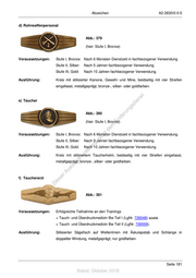 A2-2630/0-0-5 Abzeichen g) Tauchmedizinisches Assistenzpersonal Abb.: 382 Voraussetzungen: Erfolgreiche Teilnahme am Training Taucherarzthelfer / Tauchmedizinischer Assistent (LgNr. 721654). Ausführung: Stilisierter Sägefisch mit Äskulapstab und Schlange in doppelter Windung, metallgeprägt; nur goldfarben. h) Versorgungs- und Nachschubpersonal st en sd i Abb.: 383 ng ru (hier: Stufe I, Bronze) de Än m Voraussetzungen: de Stufe I, Bronze: Nach 6 Monaten Dienstzeit in fachbezogener Verwendung. ht Stufe II, Silber: Nach 5 Jahren fachbezogener Verwendung. ic tn Stufe III, Gold: Nach 10 Jahren fachbezogener Verwendung. eg rli Ausführung: te Kreis mit stilisiertem Buchstaben „V“, beidseitig mit vier Streifen eingefasst, un metallgeprägt; bronze-, silber- oder goldfarben. k uc dr us rA se ie D Seite 182 Stand: Oktober 2016