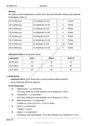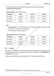 A2-2630/0-0-5 Abzeichen Wertung: Als Treffer sind alle Handgranaten zu werten, die in das Ziel hineintreffen, Wertung nach folgender Punktetabelle (Treffer in): 20 m Entfernung im Innenkreis (2 m Ø) = 7 Punkte. 20 m Entfernung im Außenkreis (4 m Ø) = 3 Punkte. 25 m Entfernung im Innenkreis (2 m Ø) = 8 Punkte. 25 m Entfernung im Außenkreis (4 m Ø) = 4 Punkte. 30 m Entfernung im Innenkreis (2 m Ø) = 9 Punkte. 30 m Entfernung im Außenkreis (4 m Ø) = 5 Punkte. 35 m Entfernung im Innenkreis (2 m Ø) = st 10 Punkte. en 35 m Entfernung im Außenkreis (4 m Ø) sd = i 6 Punkte. ng ru de Geforderte Punkte für die einzelnen Stufen: Än m Lebensalter Stufe I de Stufe II Stufe III ht bis 29 Jahre 64 ic 66 70 tn bis 44 Jahre 60 eg 62 65 rli te ab 45 Jahre 55 un 58 60 k uc dr c) Hindernislauf: us rA + Laufstrecke 400 m mit 14 Hindernissen in einem annähernd ebenen Gelände. se + Anzug: Feldanzug, Tarndruck, allgemein. ie D Art der Hindernisse: + S Stolperstrecke: 1 x zu überwinden, (10 m lang, Drähte 35 cm über Erdboden und im Abstand von 1,25 m). + K Kriechstrecke: 1 x zu überwinden, (20 m lang, Drähte 60 cm über Erdboden und im Abstand von 1,25 m). + B Balkenhindernisse: 4 x zu überwinden, (3 Balken ca. 12 bis 15 cm Ø in 1, 2 und 3 m Höhe). + H Hürde: 4 x zu überwinden, (1 Balken 1 m hoch). + G Graben: 4 x zu überwinden, (Darstellung: zwei Trassierbänder, 10 cm über Erdboden und im Abstand von 1,5 m). Seite 210 Stand: Oktober 2016