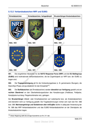 Abzeichen A2-2630/0-0-5 5.13.2 Verbandsabzeichen NRF und EUBG Ärmelabzeichen Ärmelabzeichen, farbgedämpft Brustanhänger/Ansteckabzeichen Abb.: 423 Abb.: 424 Abb.: 425 st en sd i ng ru de Än m de ht ic tn eg rli te Abb.: 426 Abb.: 427 un Abb.: 428 k uc 591. Die eingeführten Abzeichen für die NATO Response Force (NRF) und die EU Battlegroup dr us (EUBG) sind multinationale Verbandsabzeichen, die bei Zugehörigkeit zur NRF bzw. der EUBG zu rA tragen sind. se ie 592. D Die Tragegenehmigung gilt für die Vorbereitungsphase (z. B. gemeinsame Übungen), die 123 Stand-Bye-Phase und grundsätzlich für den Einsatzfall . 593. Die Stoffabzeichen (als Ärmelabzeichen) werden dienstlich zur Verfügung gestellt und am rechten Oberärmel an den Oberbekleidungsstücken des Kampfanzuges (Feldbluse, Feldjacke, Kampfjacke kurz/lang, Fliegerkombination etc.) getragen. Der Brustanhänger (Metall- oder Emailleabzeichen auf Lederlasche bzw. als Ansteckabzeichen) wird dienstlich nicht zur Verfügung gestellt. Die Tragebestimmungen richten sich nach den Nrn. 588 bzw. 589. Marineangehörige und Soldatinnen aller milOrgBer dürfen in adäquater Anwendung der Nr. 588 das NRF-Verbandsabzeichen und das EUBG-Verbandsabzeichen an der Dienstjacke als Ansteckabzeichen tragen. 123 Diese Regelung stellt die einzige Ausnahme zur Nr. 211 dar. Seite 215 Stand: Oktober 2016