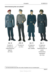 A2-2630/0-0-5 Anzugarten 248. Ergänzungen der Grundformen (Großer Dienstanzug, Heer und Luftwaffe) Heer Luftwaffe Besonderheiten zur Trageweise E1 Mantel, grau E2 Mantel, blau E3 Fingerhandschuhe, allgemein 249. Abwandlungen der Grundformen (Großer Dienstanzug, Heer und Luftwaffe) Heer Luftwaffe Besonderheiten zur Trageweise A1 Gefechtshelm Ohne Helmüberzug 250. Kombinationen (Großer Dienstanzug, Heer und Luftwaffe) st en sd i Die Grundformen des Großen Dienstanzuges dürfen auf Befehl auch ohne Dienstjacke/Schibluse, ng grau oder mit Diensthemd/Dienstbluse, kurzer Ärmel, getragen werden. ru de Weitere, selbstständige Ergänzungen / Abwandlungen der Grundformen des Großen Dienstanzuges Än sind nicht zulässig. m de ht ic tn eg rli te un k uc dr us rA se ie D Seite 60 Stand: Oktober 2016