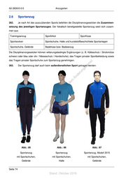 A2-2630/0-0-5 Anzugarten 2.6 Sportanzug 262. Je nach Art des auszuübenden Sports befehlen die Disziplinarvorgesetzten die Zusammen- setzung des jeweiligen Sportanzuges. Der fiskalisch bereitgestellte Sportanzug setzt sich zusam- men aus: Trainingsanzug Sporttrikot Sporthose Sportsocken Sportschuhe, Halle und kunststoffbeschichtete Sportanlagen Sportschuhe, Gelände Badehose bzw. Badeanzug Die Disziplinarvorgesetzten können witterungsbedingte Ergänzungen (z. B. Kälteschutz / Strickmütze schwarz oder blau oder oliv / Nässeschutz / Handschuhe), das Tragen privater Sportbekleidung sowie das Tragen privater Sportschuhe zum Sportanzug genehmigen. st en 263. Der Sportanzug darf auch beim außerdienstlichen Sport getragen werden. sd i ng ru de Än m de ht ic tn eg rli te un k uc dr us rA se ie D Abb.: 85 Abb.: 86 Abb.: 87 Sportanzug Sportanzug Sportanzug, Modell 2015 mit Sportschuhen, mit Sportschuhen, mit Sportschuhen, Gelände Halle Gelände Seite 74 Stand: Oktober 2016