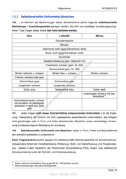 Allgemeines A2-2630/0-0-5 1.2.3 Selbstbeschaffte Uniformteile/Abzeichen 140. Im Rahmen der Bestimmungen dieser Zentralrichtlinie dürfen folgende selbstbeschaffte Bekleidungs- / Ausrüstungsartikel getragen werden, die nicht zum jeweiligen Ausstattungssoll ge- 9 hören. Das Tragen dieser Artikel darf nicht befohlen werden. Heer Luftwaffe Marine Ganzjahresjacke Blouson Oberhemd, weiß (nicht Diensthemd, weiß) Bluse, weiß (nicht Dienstbluse, weiß) Querbinder Gesellschaftsanzug (gem. Abschnitt 2.5) st Trauerband, schwarz (gem. Nr. 323) en sd i Namensschild (gem. Nr. 432) ng Winkel, anthrazit u. schwarz Winkel, blau u. schwarz ru Winkel, schwarz de Pullover, schwarz oder grau Än Schirmmütze, grau m Schirmmütze, blau de Langbinder, schwarz Langbinder, schwarz ht ic Schal, grau Seidenschal, blau tn Schal, weiß eg Lederkoppel, schwarz mit Kas- rli tenschloss 10 te Aufschiebeschlaufen, schwar- un zer Grundton mit Dienstgrad- k uc abzeichen in weiß bzw. gold- dr gelb us rA 141. Jedes Tragen nicht dieser Zentralrichtlinie entsprechender Uniformteile (z.B. die Ergän- se ie zung / Abwandlung der Uniform mit nicht zugelassenen ausländischen Uniformteilen), das Anlegen D nicht genehmigter oder in Form und Farbe abweichender Abzeichen sowie zweckwidrige Verwen- dung bundeswehreigener Bekleidung ist unzulässig. 142. Selbstbeschaffte Uniformteile und Abzeichen haben in Form, Farbe und Beschaffenheit den dienstlich gelieferten zu entsprechen. Keine Trageerlaubnis besteht dagegen für selbstbeschaffte Bekleidungsartikel mit Schutzfunktionen, insbesondere Artikel der Kampfbekleidung (Feldanzug, Bord- und Gefechtsanzug und Flugdienstan- zug – jeweils in allen Varianten), der Persönlichen Schutzkleidung (PSA), Augen- bzw. ballistischen Schutzausrüstung sowie der Schneid- und Schanzausrüstung. 9 Sofern nicht ein einheitlicher Anzug gemäß Nr. 109 befohlen wurde. 10 Wird anlassbezogen dienstlich bereitgestellt. Seite 13 Stand: Oktober 2016