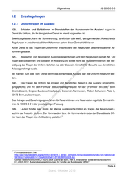 Allgemeines A2-2630/0-0-5 1.2 Einzelregelungen 1.2.1 Uniformtragen im Ausland 120. Soldaten und Soldatinnen in Dienststellen der Bundeswehr im Ausland tragen im Dienst die Uniform, die für den gleichen Dienst im Inland vorgesehen ist. Soweit zugelassen, kann der Sommeranzug, sandfarben oder weiß, getragen werden. Abweichende Regelungen in zwischenstaatlichen Abkommen gehen dieser Zentralrichtlinie vor. Außer Dienst ist das Tragen der Uniform nur entsprechend den Regelungen zwischenstaatlicher Ab- kommen gestattet. 121. Abgesehen von besonderen Auslandsverwendungen und den Regelungen gemäß Nr. 120 tragen alle Soldatinnen und Soldaten im Ausland Zivil, soweit nicht das Bundesministerium der Ver- st en teidigung das Tragen der Uniform befohlen hat oder dieses im Einzelfall für Besuche aus dienstlichem sd i Anlass genehmigt wurde. ng ru de Bei Fahrten zum oder vom Dienst durch das benachbarte Ausland darf die Uniform mitgeführt wer- Än den. m de 122. Das Tragen der Uniform bei privaten und dienstlichen Reisen in das Ausland ist genehmi- ht ic gungspflichtig und mit dem Formular „Besuchsantrag/Request for visit“ (Formular Bw/2338) beim 6 tn eg Streitkräfteamt, Gruppe Bundeswehraufgaben, Dezernat Alarmwesen, Robert-Schumann-Platz 3, rli 53175 Bonn, zu beantragen. te un Das Antrags- und Genehmigungsverfahren für Reservistinnen und Reservisten regelt die Zentralricht- k uc linie A2-1300/0-0-2 in der jeweils gültigen Fassung. dr us 123. rA Laufen Schiffe oder Boote der Marine ausländische Häfen an, tragen die Besatzungen - se auch in der Freizeit - Uniform. Der Kommandant bzw. die Kommandantin oder der Dienstälteste Offi- ie D zier kann das Tragen von Zivilkleidung gestatten. 7 6 Formulardatenbank Bw: http://zrp21.bundeswehr.org/fachinfo/i_terrwv/fi_i_terrwv_formulare.nsf/b21d6abd850524dcc12575a60031a8 56/560b374d4d4dc85141256e4b0045a615/$FILE/B0N02338.doc 7 Gemäß Bereichsvorschrift C1-200/0-3304 „Dienst an Bord, Heft 4, Innendienst“ sowie Bereichsvorschrift C1-200/0-3312 „Auslandsreisebestimmungen für Schiffe der Bundeswehr (ARB)“. Seite 9 Stand: Oktober 2016
