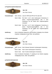 Abzeichen A2-2630/0-0-5 o) Ständige Luftfahrzeugbesatzungsangehörige Abb.: 374 (hier: Stufe I, Bronze) Voraussetzungen: Stufe I, Bronze: Besitz des Militärluftfahrzeugbesatzungsscheins. Stufe II, Silber: Wie Stufe I und 1 200 Flugstunden. Stufe III, Gold: Wie Stufe I und 1 800 Flugstunden. Anmerkung: Als Flugstunden angerechnet wird die gesamte Flugzeit als Luftfahrzeugbesatzungsangehörige einschließlich der Ausbildung. Ausführung: Kreis mit stilisiertem Globus in Doppelschwinge mit unterem Federkranz, st metallgeprägt; bronze-, silber- oder goldfarben. en sd i ng ru p) Technisches Personal de Än m Abb.: 375 de ht ic (hier: Stufe I, Bronze) tn eg rli Voraussetzungen: te Stufe I, Bronze: Nach 6 Monaten Dienstzeit in fachbezogener Verwendung. un k Stufe II, Silber: Nach 5 Jahren fachbezogener Verwendung. uc dr Stufe III, Gold: us Nach 10 Jahren fachbezogener Verwendung. rA Ausführung: Kreis mit stilisiertem Zahnkranz und kreisenden Elektronen, beidseitig mit vier se ie Streifen eingefasst, metallgeprägt; bronze-, silber- oder goldfarben. D Seite 179 Stand: Oktober 2016