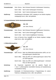 A2-2630/0-0-5 Abzeichen Voraussetzungen: Stufe I, Bronze: Nach 6 Monaten Dienstzeit in fachbezogener Verwendung. Stufe II, Silber: Nach 5 Jahren fachbezogener Verwendung. Stufe III, Gold: Nach 10 Jahren fachbezogener Verwendung. Ausführung: Kreis/Weltkugel mit Buchstaben „GEO“, beidseitig mit vier Streifen eingefasst, metallgeprägt; bronze-, silber- oder goldfarben. h) Kompaniefeldwebel, Schiffs-/Geschwaderwachtmeister Abb.: 366 (hier: Stufe I, Bronze) st en Voraussetzungen: sd Stufe I, Bronze: Nach 6 Monaten Dienstzeit in fachbezogener Verwendung. i ng Stufe II, Silber: ru Nach 5 Jahren fachbezogener Verwendung. de Stufe III, Gold: Än Nach 10 Jahren fachbezogener Verwendung. m Ausführung: de Kreis mit Eisernem Kreuz, beidseitig mit vier Streifen eingefasst, metallge- ht prägt; bronze-, silber- oder goldfarben. ic tn eg rli i) Militärluftfahrzeugführer te un k uc Abb.: 367 dr us (hier: Stufe I, Bronze) rA se Voraussetzungen: ie Stufe I, Bronze: Besitz des Militärluftfahrzeugführerscheins (MFS) und Luft- D fahrzeugführergrad 3 (Standard Pilot). Stufe II, Silber: Besitz des MFS und Luftfahrzeugführergrad 2 (Senior Pilot) und 1200 Flugstunden. Stufe III, Gold: Besitz des MFS und Luftfahrzeugführergrad 1 (Command Pilot) und 1800 Flugstunden. Anmerkung: Als Flugstunden angerechnet wird die gesamte Flugzeit als 1. bzw. 2. Luftfahrzeugführer einschließlich Schulung und Auswahlschulung mit dienstlichem Auftrag. Ausführung: Bundesadler mit Eichenlaubumrandung in Doppelschwinge mit unterem Federkranz, metallgeprägt; bronze-, silber- oder goldfarben. Seite 176 Stand: Oktober 2016