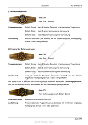 Abzeichen A2-2630/0-0-5 j) Militärmusikpersonal Abb.: 368 (hier: Stufe I, Bronze) Voraussetzungen: Stufe I, Bronze: Nach 6 Monaten Dienstzeit in fachbezogener Verwendung. Stufe II, Silber: Nach 5 Jahren fachbezogener Verwendung. Stufe III, Gold: Nach 10 Jahren fachbezogener Verwendung. Ausführung: Kreis mit stilisierter Lyra, beidseitig mit vier Streifen eingefasst, metallgeprägt; bronze-, silber- oder goldfarben. st en sd i k) Personal der Sicherungstruppe ng ru de Abb.: 369 Än m de (hier: Stufe I, Bronze) ht ic tn Voraussetzungen: Stufe I, Bronze: Nach 6 Monaten Dienstzeit in fachbezogener Verwendung. eg rli Stufe II, Silber: Nach 5 Jahren fachbezogener Verwendung. te un Stufe III, Gold: k Nach 10 Jahren fachbezogener Verwendung. uc Ausführung: dr Kreis mit stilisierte, gekreuzten Gewehren, beidseitig mit vier Streifen us rA eingefasst, metallgeprägt; bronze-, silber- oder goldfarben. se ie Das bisher auch an Personal der Sicherungstruppe verliehene Abzeichen „Sicherungspersonal“ D darf von den Inhabern bis zum Ausscheiden aus dem Dienst weiter getragen werden. Abb.: 370 (hier: „Sicherungspersonal“, Stufe I, Bronze) Voraussetzungen: Wie Personal der Sicherungstruppe. Ausführung: Kreis mit stilisierter Flugabwehrkanone, beidseitig mit vier Streifen eingefasst, metallgeprägt; bronze-, silber- oder goldfarben. Seite 177 Stand: Oktober 2016