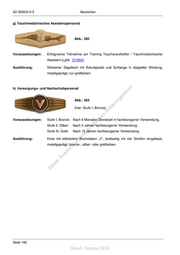 Abzeichen A2-2630/0-0-5 d) Rohrwaffenpersonal Abb.: 379 (hier: Stufe I, Bronze) Voraussetzungen: Stufe I, Bronze: Nach 6 Monaten Dienstzeit in fachbezogener Verwendung. Stufe II, Silber: Nach 5 Jahren fachbezogener Verwendung. Stufe III, Gold: Nach 10 Jahren fachbezogener Verwendung. Ausführung: Kreis mit stilisierter Kanone, Gewehr und Mine, beidseitig mit vier Streifen eingefasst, metallgeprägt; bronze-, silber- oder goldfarben. st e) Taucher en sd i ng Abb.: 380 ru de Än (hier: Stufe I, Bronze) m de Voraussetzungen: ht Stufe I, Bronze: Nach 6 Monaten Dienstzeit in fachbezogener Verwendung. ic Stufe II, Silber: tn Nach 5 Jahren fachbezogener Verwendung. eg Stufe III, Gold: Nach 10 Jahren fachbezogener Verwendung. rli te Ausführung: un Kreis mit stilisiertem Taucherhelm, beidseitig mit vier Streifen eingefasst, k uc metallgeprägt; bronze-, silber- oder goldfarben. dr us rA f) Taucherarzt se ie D Abb.: 381 Voraussetzungen: Erfolgreiche Teilnahme an den Trainings + Tauch- und Überdruckmedizin Bw Teil I (LgNr. 726548) sowie + Tauch- und Überdruckmedizin Bw Teil II (LgNr. 726559). Ausführung: Stilisierter Sägefisch auf Wellenlinien mit Äskulapstab und Schlange in doppelter Windung, metallgeprägt; nur goldfarben. Seite 181 Stand: Oktober 2016