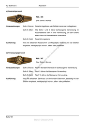 A2-2630/0-0-5 Abzeichen 5.10.5 Tätigkeitsabzeichen des Heeres a) Feldjäger Abb.: 376 (hier: Stufe I, Bronze) Voraussetzungen: Stufe I, Bronze: Nach 6 Monaten Dienstzeit in fachbezogener Verwendung. Stufe II, Silber: Nach 5 Jahren fachbezogener Verwendung. Stufe III, Gold: Nach 10 Jahren fachbezogener Verwendung. Ausführung: Kreis mit achtzackigem Stern, beidseitig mit vier Streifen eingefasst, st en metallgeprägt; bronze-, silber- oder goldfarben. sd i ng ru b) Kraftfahrpersonal de Än m Abb.: 377 de ht ic (hier: Stufe I, Bronze) tn eg rli Voraussetzungen: Stufe I, Bronze: Nach 6 Monaten Dienstzeit in fachbezogener Verwendung. te un Stufe II, Silber: k Nach 5 Jahren fachbezogener Verwendung. uc Stufe III, Gold: Nach 10 Jahren fachbezogener Verwendung. dr us Ausführung: Kreis mit stilisiertem Kraftfahrzeug, beidseitig mit vier Streifen eingefasst, rA se metallgeprägt; bronze-, silber- oder goldfarben. ie D c) Personal im allgemeinen Heeresdienst Abb.: 378 (hier: Stufe I, Bronze) Voraussetzungen: Stufe I, Bronze: Nach 6 Monaten Dienstzeit in fachbezogener Verwendung. Stufe II, Silber: Nach 5 Jahren fachbezogener Verwendung. Stufe III, Gold: Nach 10 Jahren fachbezogener Verwendung. Ausführung: Kreis mit zwei stilisiertem, gekreuzten Säbeln, beidseitig mit vier Streifen eingefasst, metallgeprägt; bronze-, silber- oder goldfarben. Seite 180 Stand: Oktober 2016