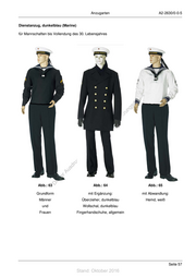 Anzugarten A2-2630/0-0-5 42 Dienstanzug, dunkelblau (Marine) für Offiziere, Unteroffiziere, Mannschaften nach Vollendung des 30. Lebensjahres st en sd i ng ru de Än m de ht ic tn eg rli te un k uc dr us rA Abb.: 59 se Abb.: 60 Abb.: 61 ie D mit Ergänzung: mit Abwandlung: mit Abwandlung: Pullover, blau Schiffchen, dunkelblau Ganzjahresjacke mit Abwandlung: Diensthemd, weiß, kurzer Winkel, schwarz Schiffchen, dunkelblau Ärmel 42 Das Namensschild bei Abb.: 60 gehört nicht zum Ausstattungssoll. Seite 55 Stand: Oktober 2016